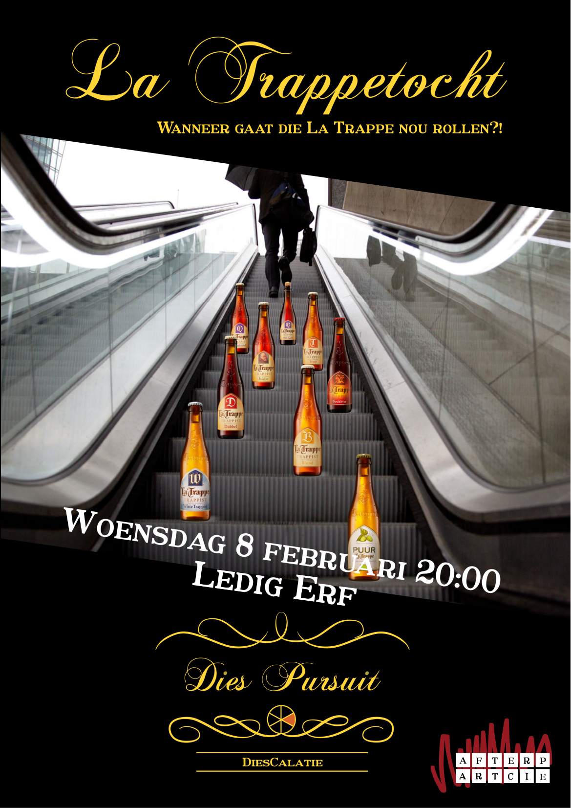 Wanneer gaat die La Trappe nou rollen?! Om echt te kunnen escaleren heb je echt escalatie nodig. Hoe anders dan met een mooi La Trappeke? Ga de strijd aan met je eergevoel en tik meteen een treetje weg. Exacte locaties en startpunten worden nog bekend gemaakt. Ps: het is dus een kroegentocht.