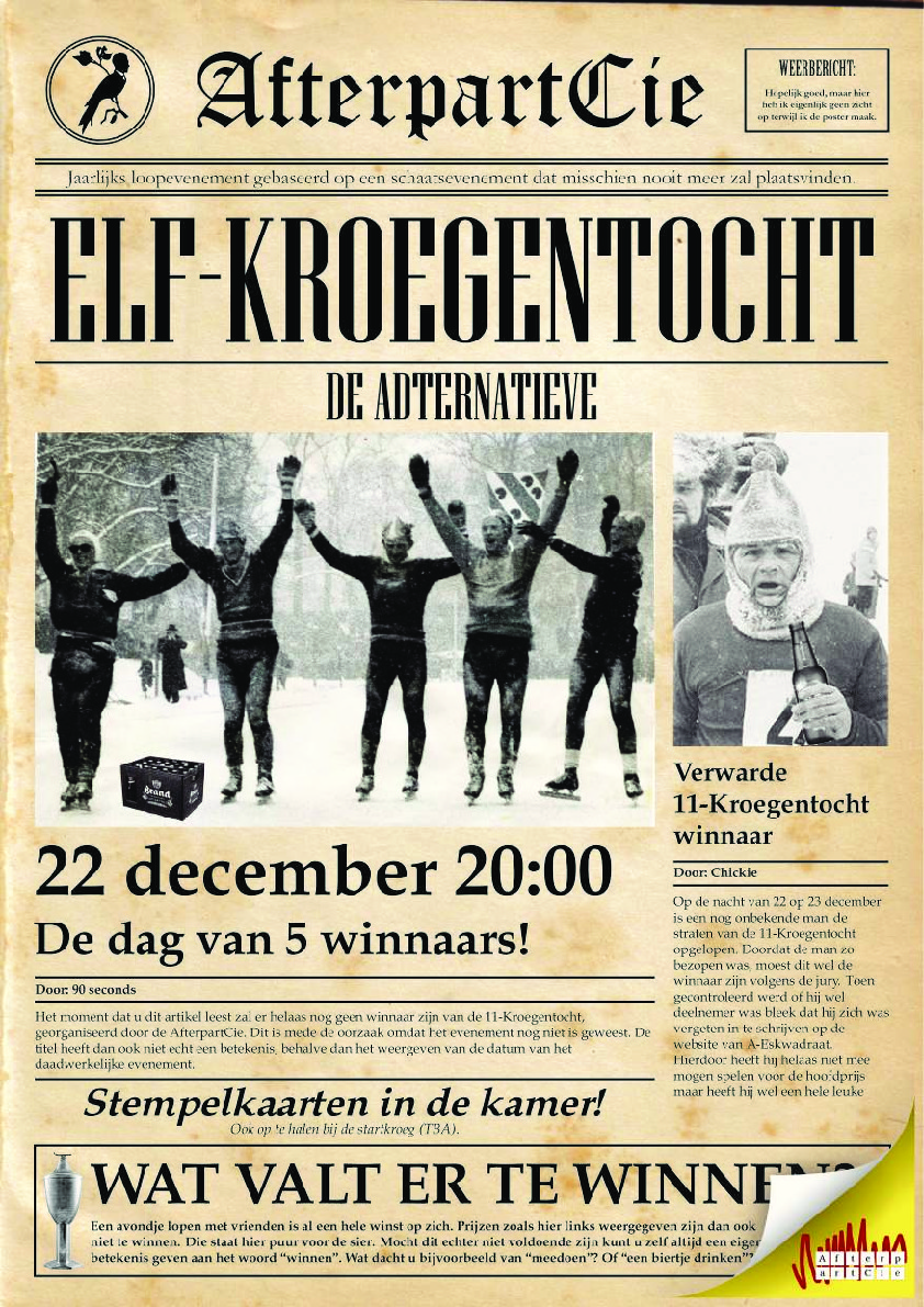 It giet oan!!! Het ijs wordt dikker en de kou sluipt de huizen binnen. Dan zit er maar één ding op: kroegentochten. Ga jij gewapend met je winterkleding en een goed gevulde fles met warm makende lekkernij op pad om de strijd te winnen? Schrijf je dan snel in! Meer info wordt vanzelf beschikbaar, haal in ieder geval je stempelkaart op in de kamer in de week voor de kerstvakantie!