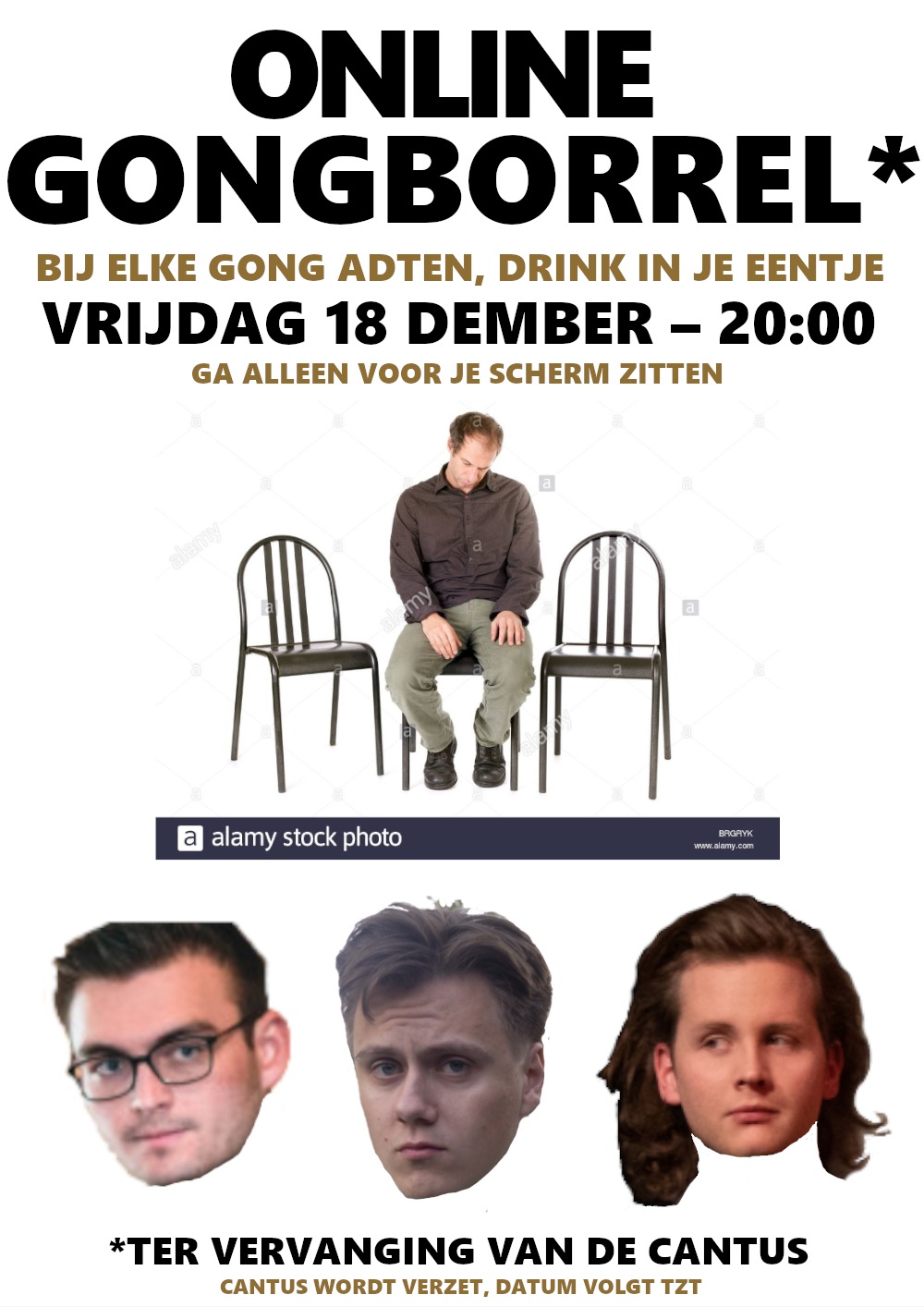 De cantus wordt helaas verzet, maar je bent natuurlijk van harte welkom bij de online gongborrel! Het concept? Je drinkt als de gong wordt geluid, verder wordt er niet gecommuniceerd. Enige vorm van plezier is onwenselijk. Bij buitensporig gedrag word je gekickt. Huisgenoten zijn niet welkom. En iedereen staat op mute.