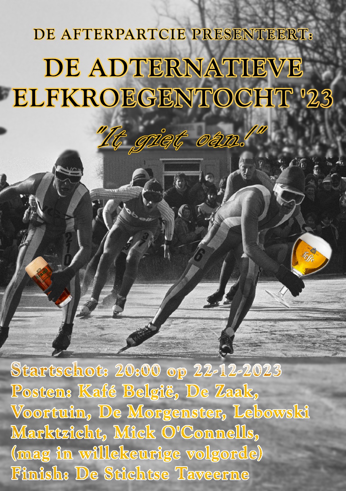 It giet oan! Of toch niet? We weten nog niet of de elfstedentocht doorgaat, daarom houden wij voor de zekerheid een adternatieve elfkroegentocht de laatste dag voor de kerstvakantie. Neem je schaatsvrienden mee en bereid je voor op deze barre tocht. We beginnen om 20:00 bij Kafe Belgie; haal jij als eerste een volle stempelkaart?