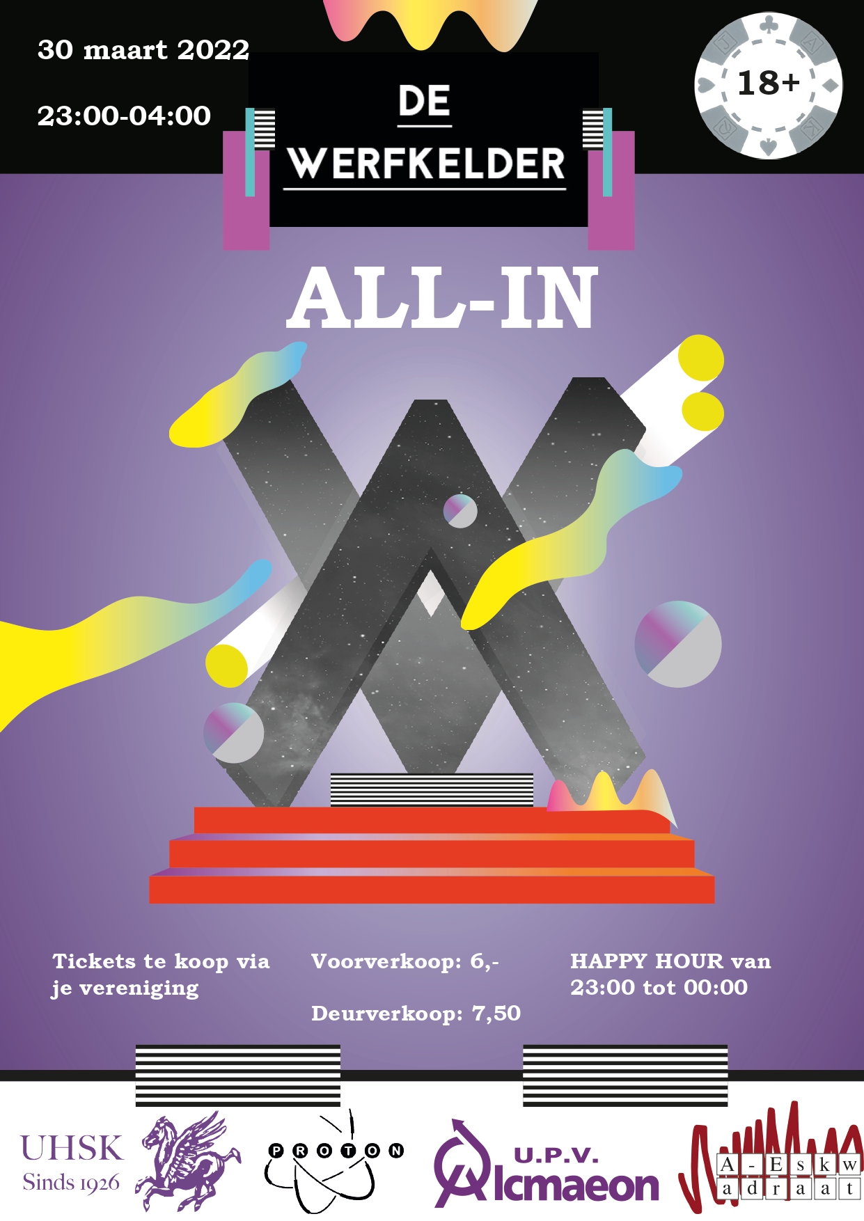 ALL-IN is eindelijk terug! A-Eskwadraat, Alcmaeon, Proton en de UHSK organiseren samen dit knallende feest op 30 maart in De Werfkelder.