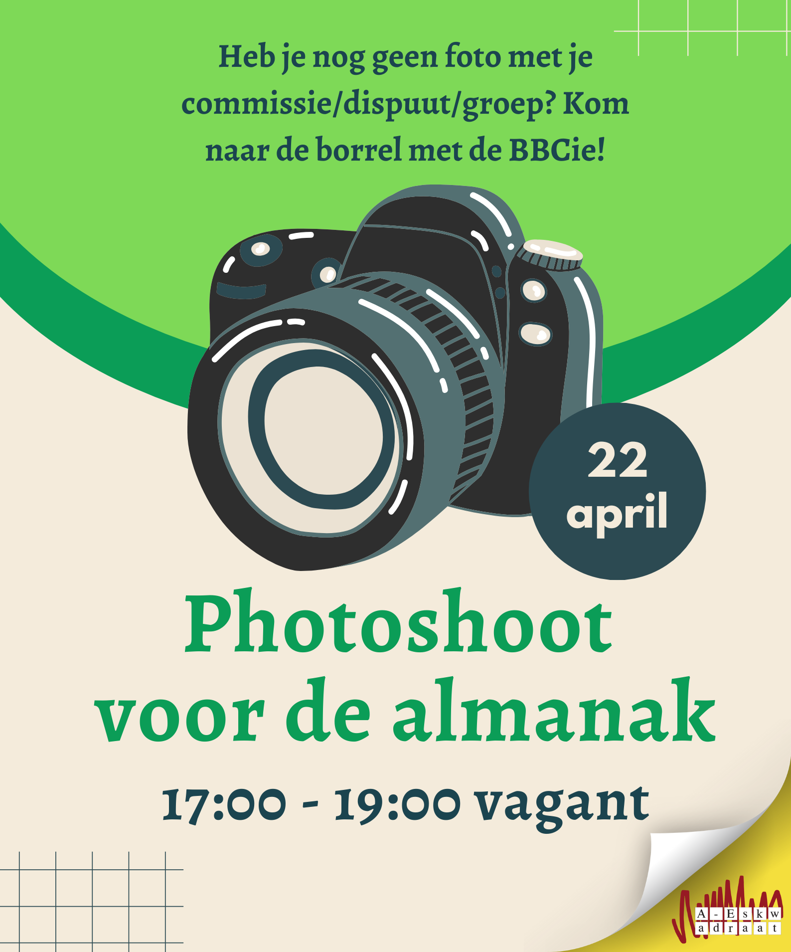 Are you in a committee,/dispuut/group at A-Eskwadraat, and don't have a group photo for the almanac yet? Gather everyone and drop by the drinks in the Vagant on April 22nd between 5 PM and 7 PM to have a group photo taken! The drinks are provided by the BBCie, we’ll take care of the photos!