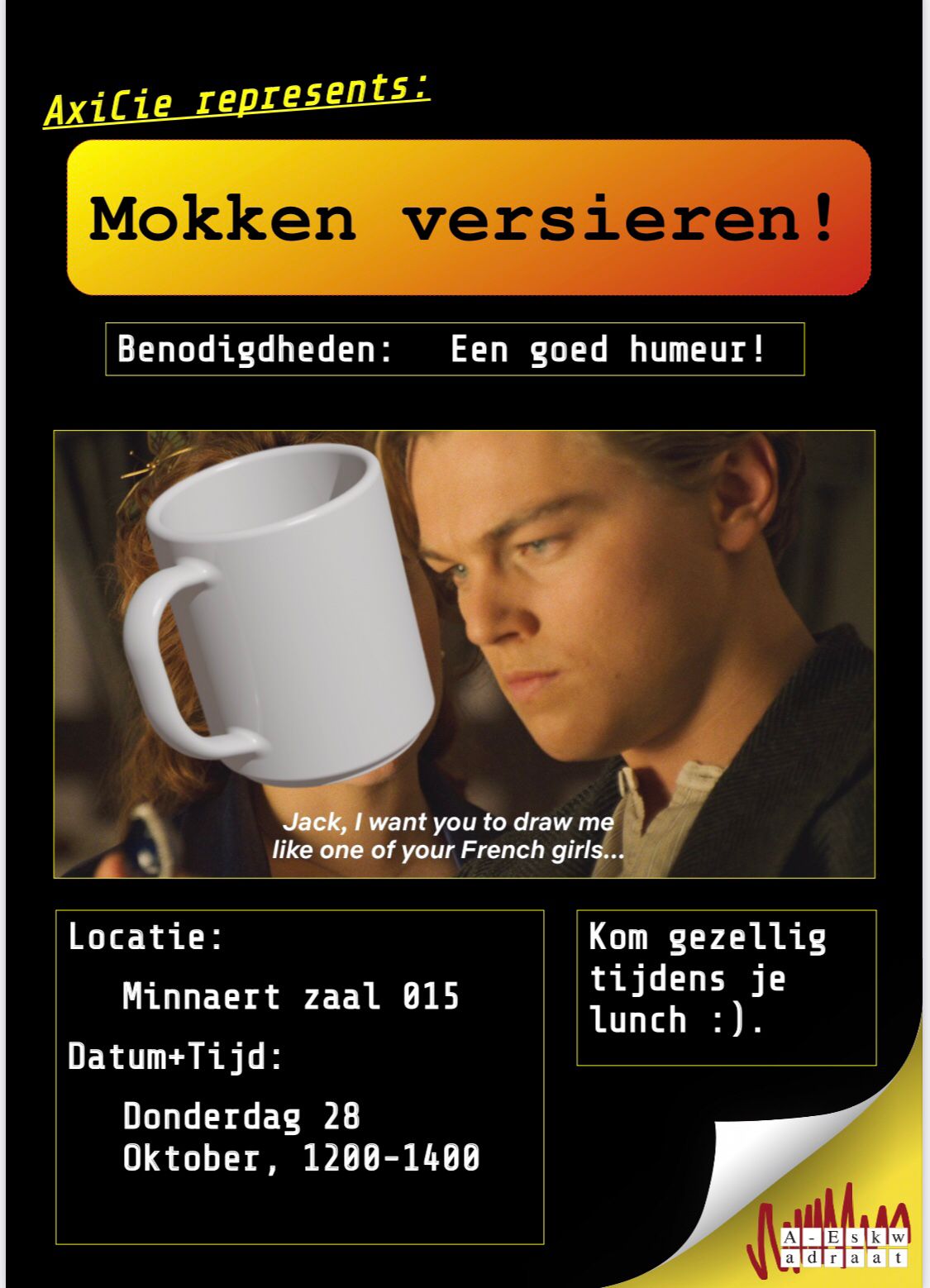 Heb je altijd al je artistieke energie willen gebruiken om een mok om te toveren tot een prachtig kunstwerk? kom gezellig langs! Je hoeft niks zelf mee te nemen en er zijn geen entree kosten. Kom dus lekker chillen, mokken versieren en zie je kunstwerk verschijnen in de woonkamer van A-Eskwadraat!