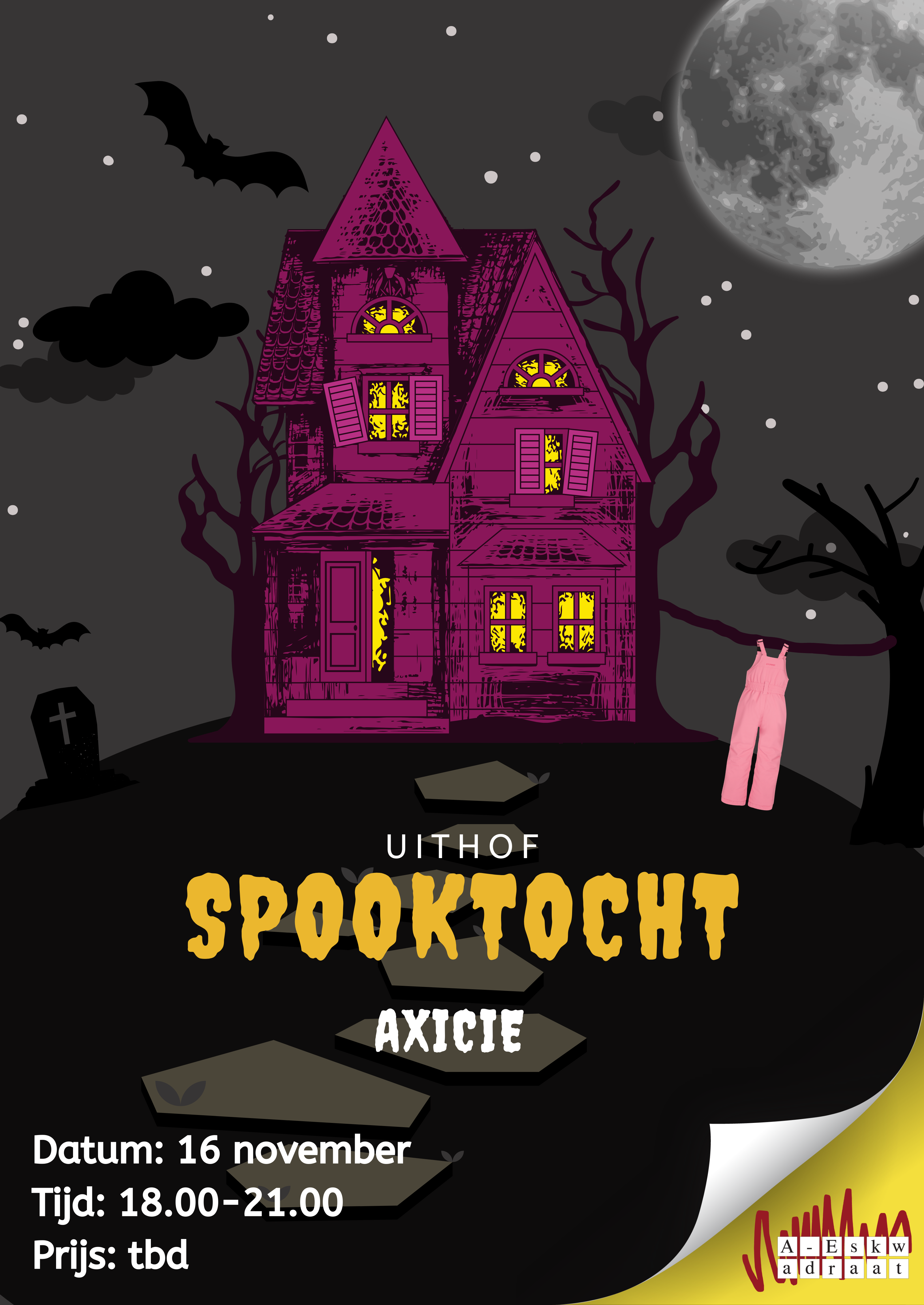 Donderdag 16 november vindt de activiteit van het jaar plaats, de Spooktocht van de AxiCie. Hebben je afgelopen tentamens je nog niet bang genoeg gemaakt, dan is dit een activiteit die je zeker niet wil missen! Mede A-Essers zullen een poging doen je op de kast te jagen. Voor het luttele bedrag van 1 euro kun je meedoen. Als je wil, kun je 3 à 4 anderen aangeven met wie je in een groepje zou willen. Het eerste groepje zal om 18:00 starten, maar je mag een voorkeurstijd aangeven mocht je nog college hebben. Zien we jullie daar?