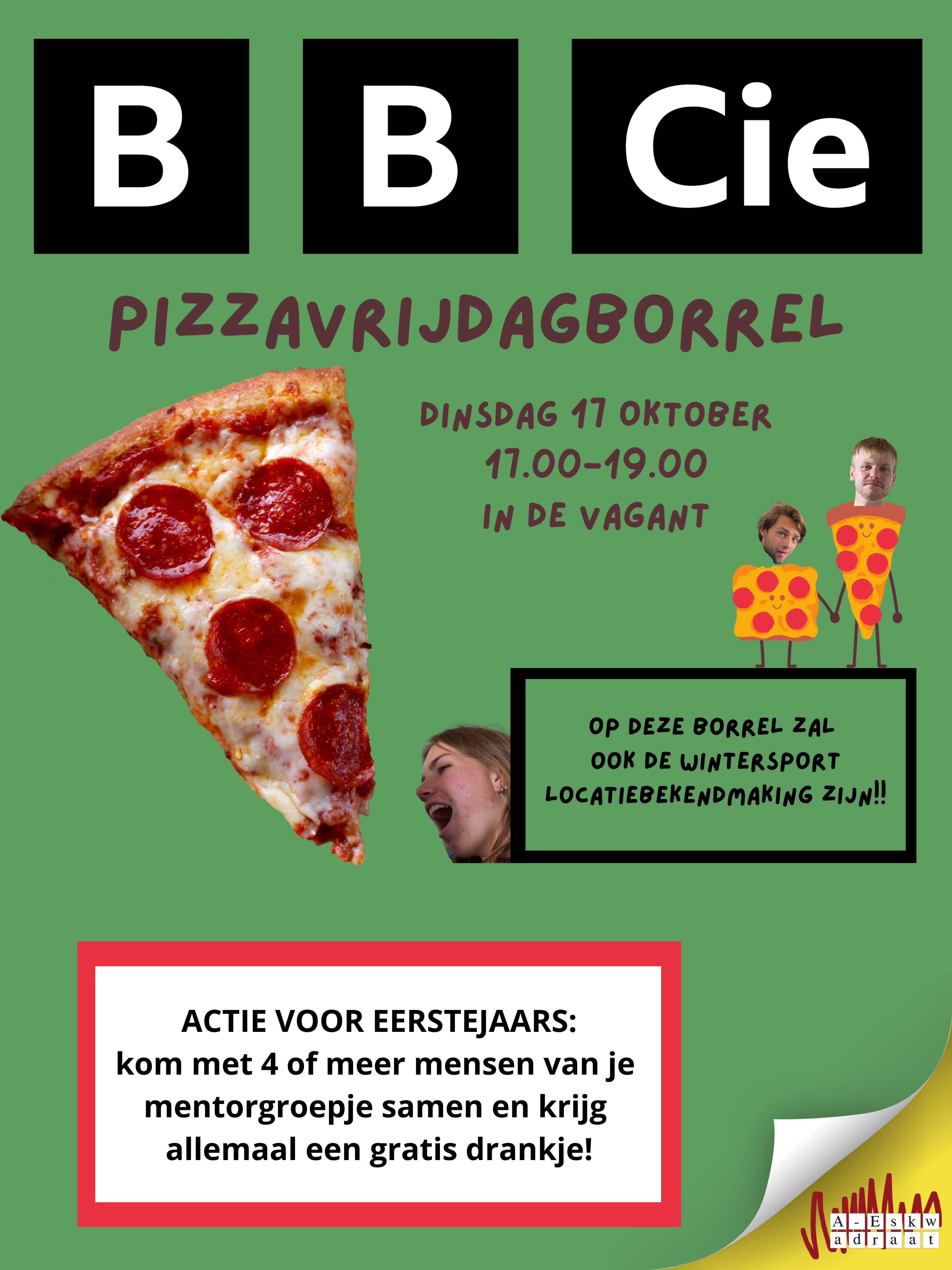 Kom aanstaande dinsdag borrelen in de Vagant! Het is dan misschien geen vrijdag maar op de borrel is het wel pizzavrijdag. Daarnaast geldt tijdens deze borrel voor eerstejaars nog een leuke actie: als je met minstens 4 mensen van je mentorgroepje komt krijgt iedereen een gratis drankje! Ook zal op deze borrel de locatiebekendmaking van de wintersport plaatsvinden. Genoeg redenen dus om erbij te zijn. Tot dan!