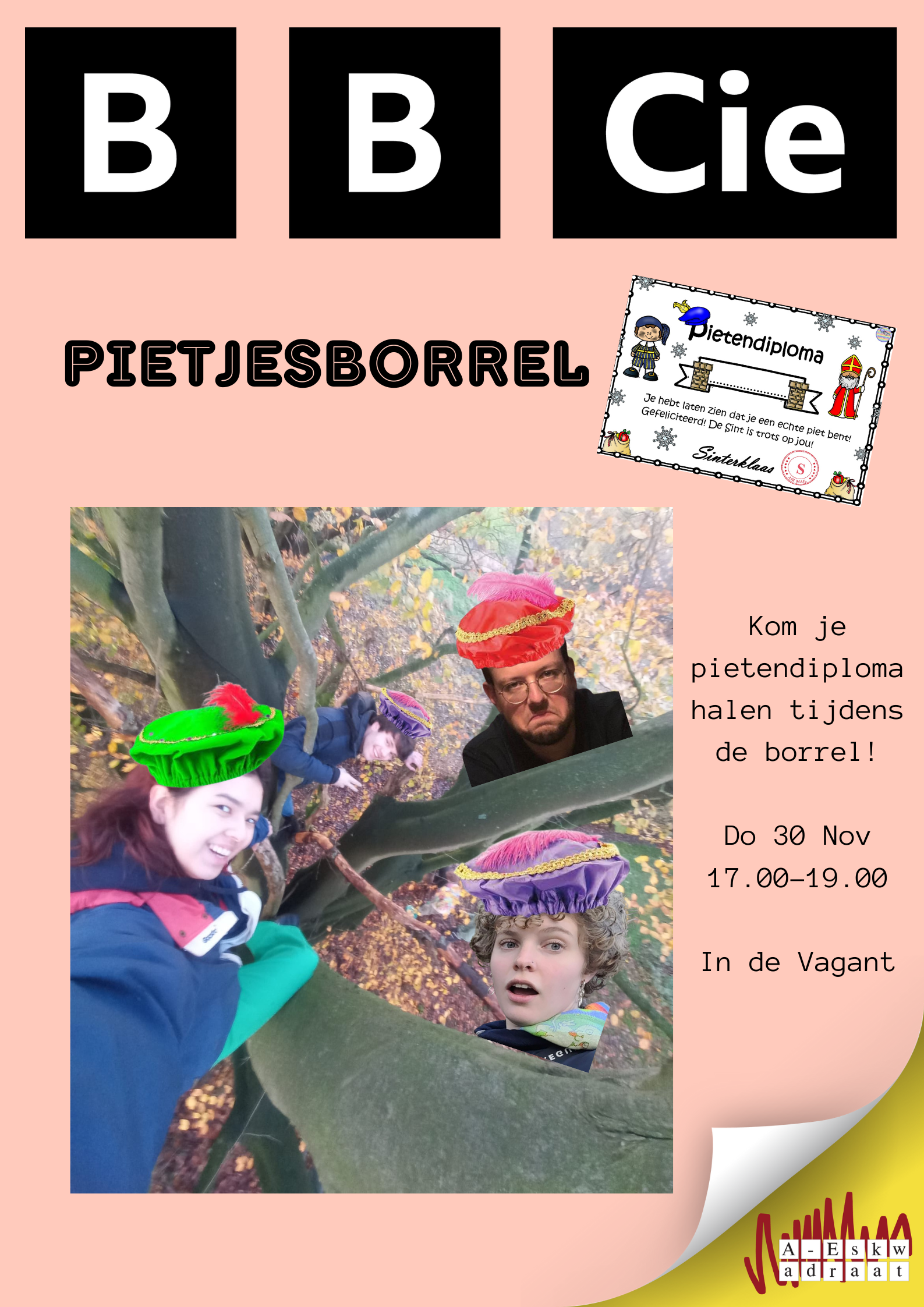 Sinterklaas is in the country and the BBCie has heard that he is looking for new Pieten. So we decided to look for them, next Thursday at the drinks! So come by on Thursday and earn your Pietendiploma while enjoying a delicious specialty beer or other drink! Then later that evening you can go to the Arie&Annefleur party in K-Sjot. Hopefully we will see you all on Thursday at 5 p.m. in the Vagant!