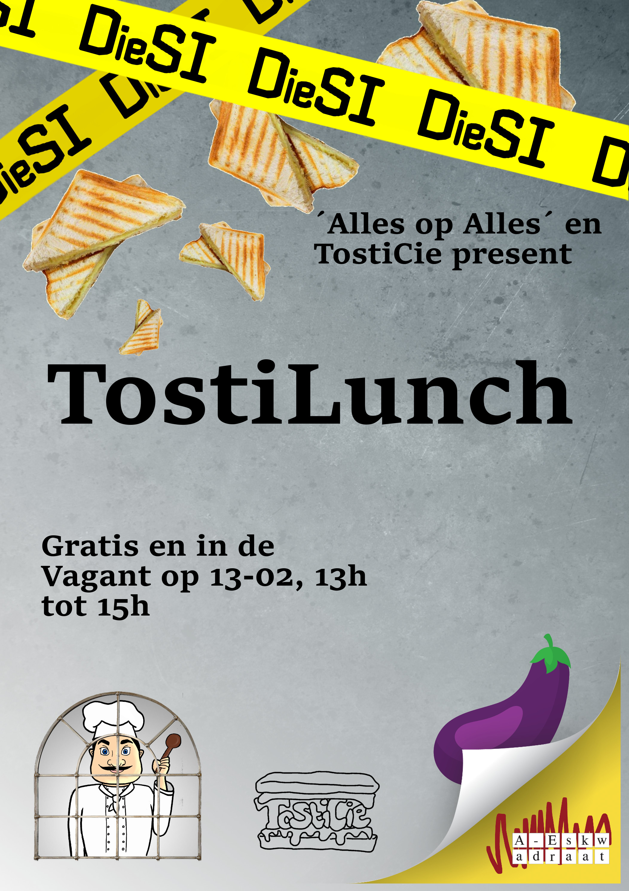 De TostiLunch! Kom je tussen 13h en 15h lekker in De Vagant volproppen met het belangrijkste onderdeel van de schijf van vijf, de tosti. En dat voor maar nul euries, hoef je niet eens je lening omhoog te gooien.