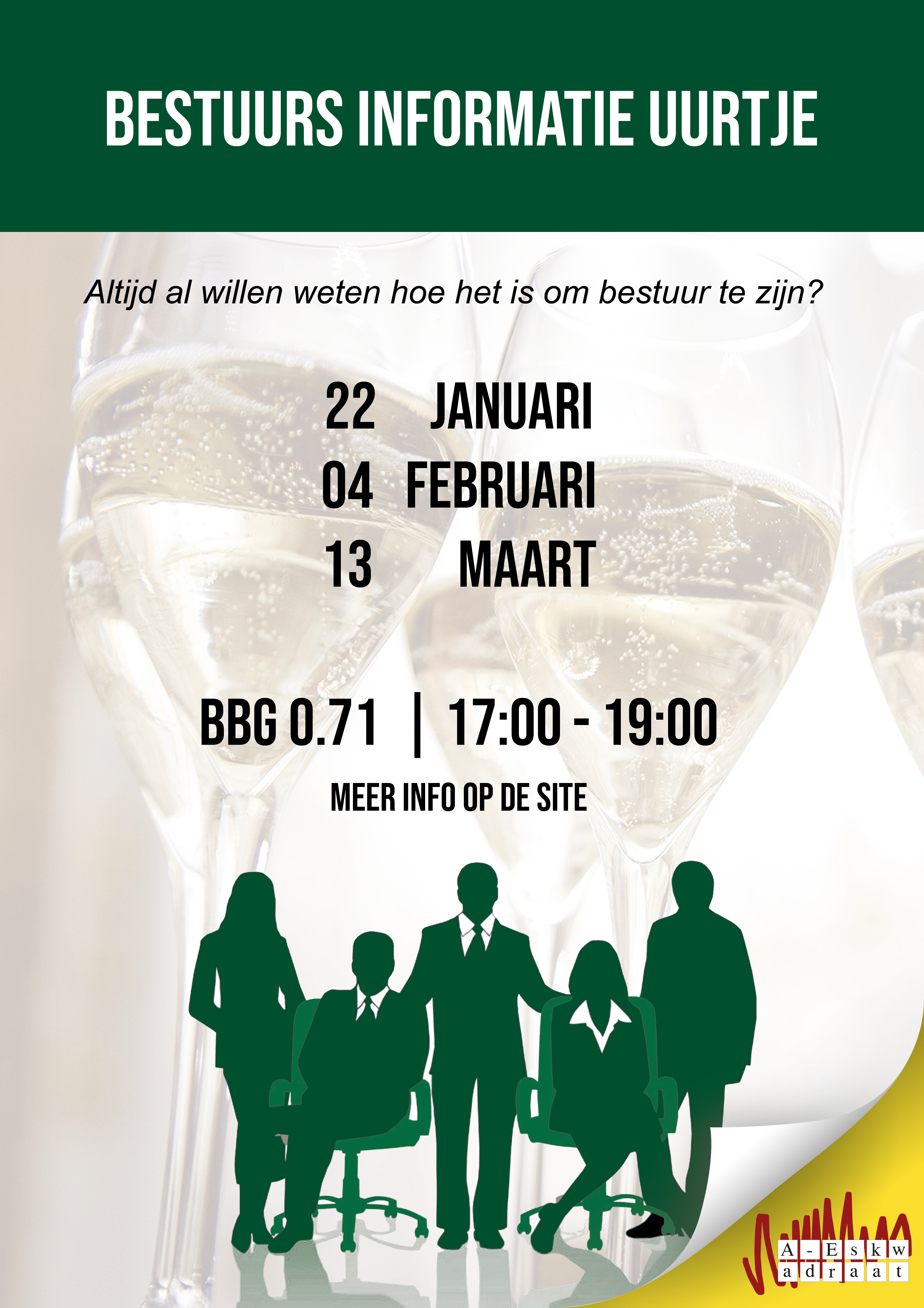 Als het antwoord op een van deze vragen ja is, kom dan naar dit informatieve uurtje! Wij zullen zo goed mogelijk proberen uit te leggen wat het "bestuur van A-Eskwadraat zijn" inhoudt, en uiteraard kun je ons al je vragen stellen. Zo kun je je eventueel oriënteren op een mogelijk bestuursjaar, of ons gewoon beter leren kennen.