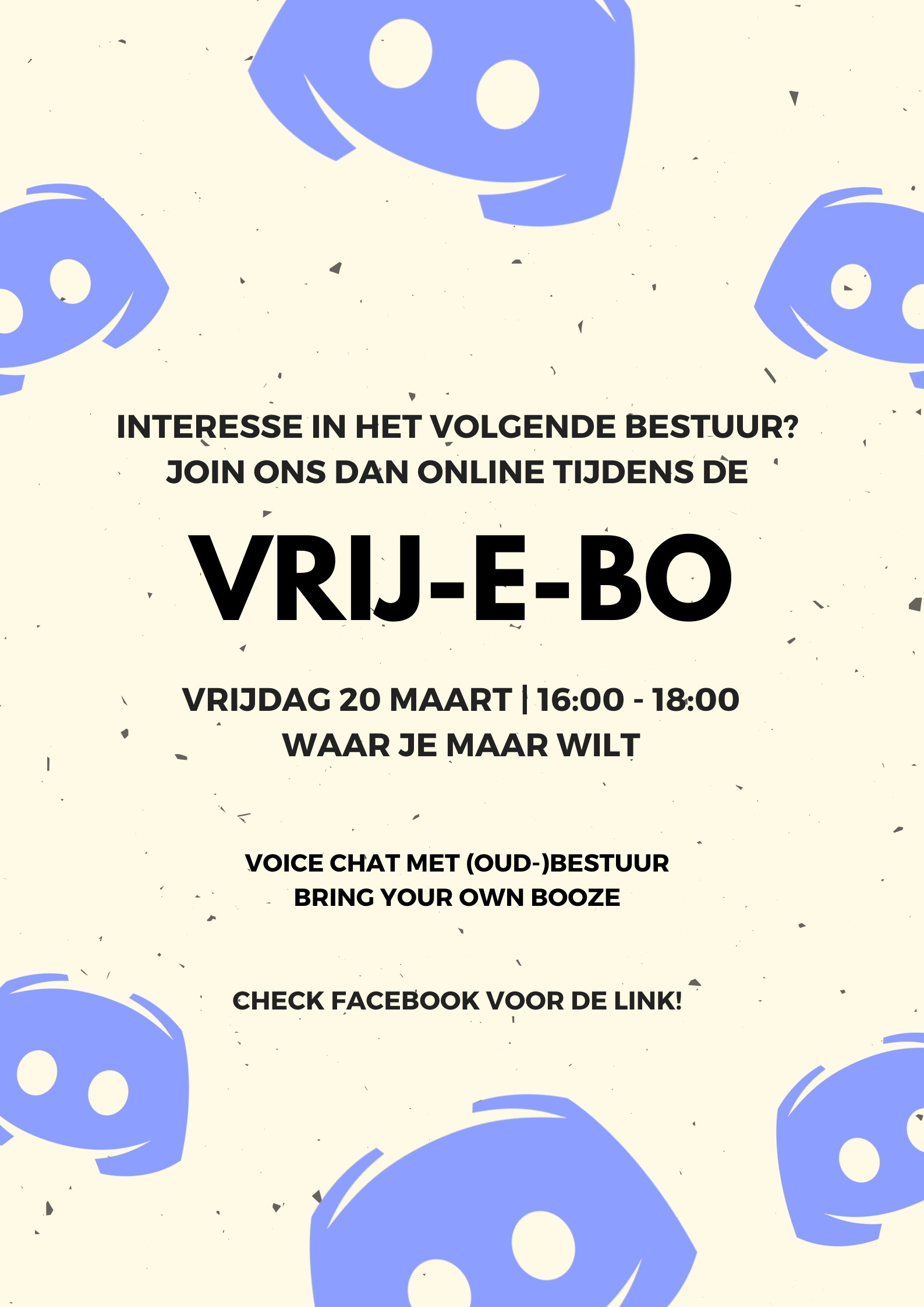 Heb je misschien wel interesse om volgend jaar het stokje van ons over te nemen en bestuur te worden? Omdat onze vrijdagmiddagborrel met bestuur en oud-bestuur natuurlijk niet kan doorgaan vanwege de virusuitbraak, kun je gezellig onze vrij-e-bo joinen! Geheel vrijblijvend kun je met bestuursleden en oud-bestuursleden kletsen via voice chat. Dit kan 1-op-1 of gewoon lekker in een groep.