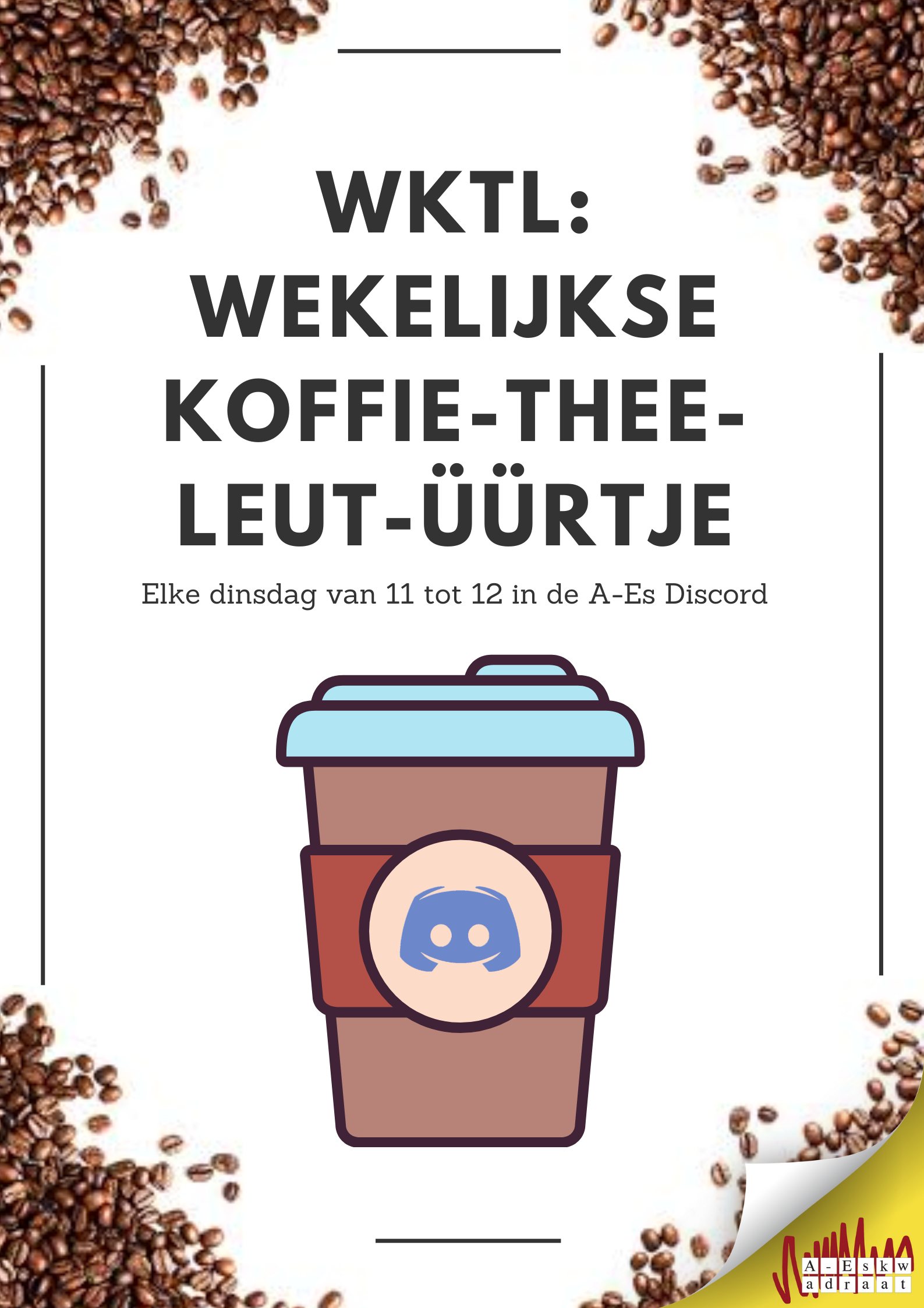 We kunnen het niet vaak genoeg zeggen, het zijn aparte tijden en het bestuur mist jullie. Daarom introduceren wij nu het WKTL'tje: het Wekelijkse Koffie-Thee-Leut-Üürtje! De komende weken zal elke dinsdag van 11 tot 12 het WKTL'tje plaatsvinden op de A-Es Discord (a-es2.nl/discord). Pak een kopje koffie, een kopje thee en voor de liefhebbers ook nog koekje en kom gezellig leuten.