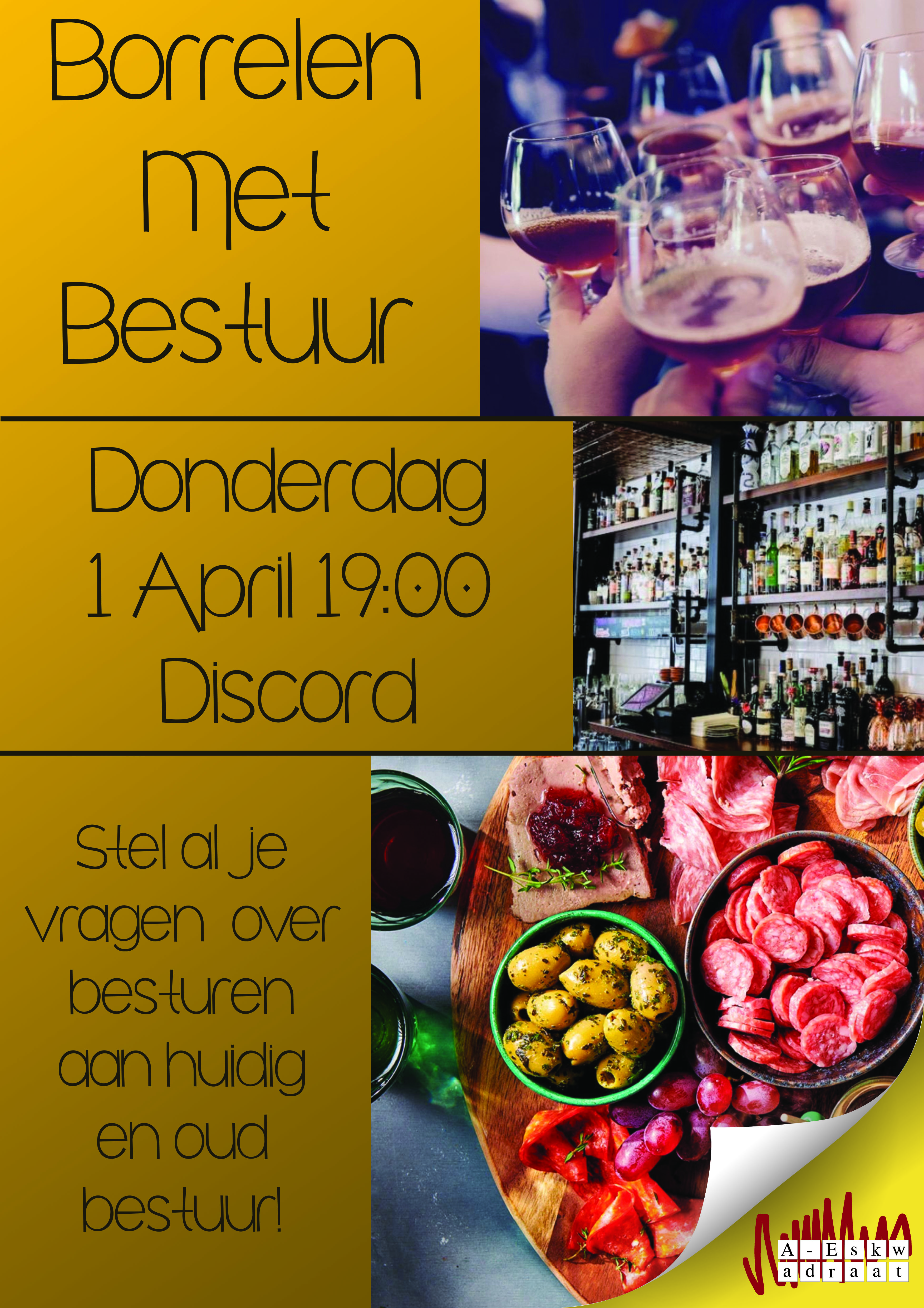 Wil je lekker onder het genot van een drankje aan oud en huidig bestuursleden vragen hoe het is (of was) om bestuur te zijn, wat nou de leukste functie is of gewoon lekker naar sterke verhalen luisteren? Kom dan gezellig borrelen op Discord op 1 April van 19:00 to 21:00 (of later als het gezellig blijft).