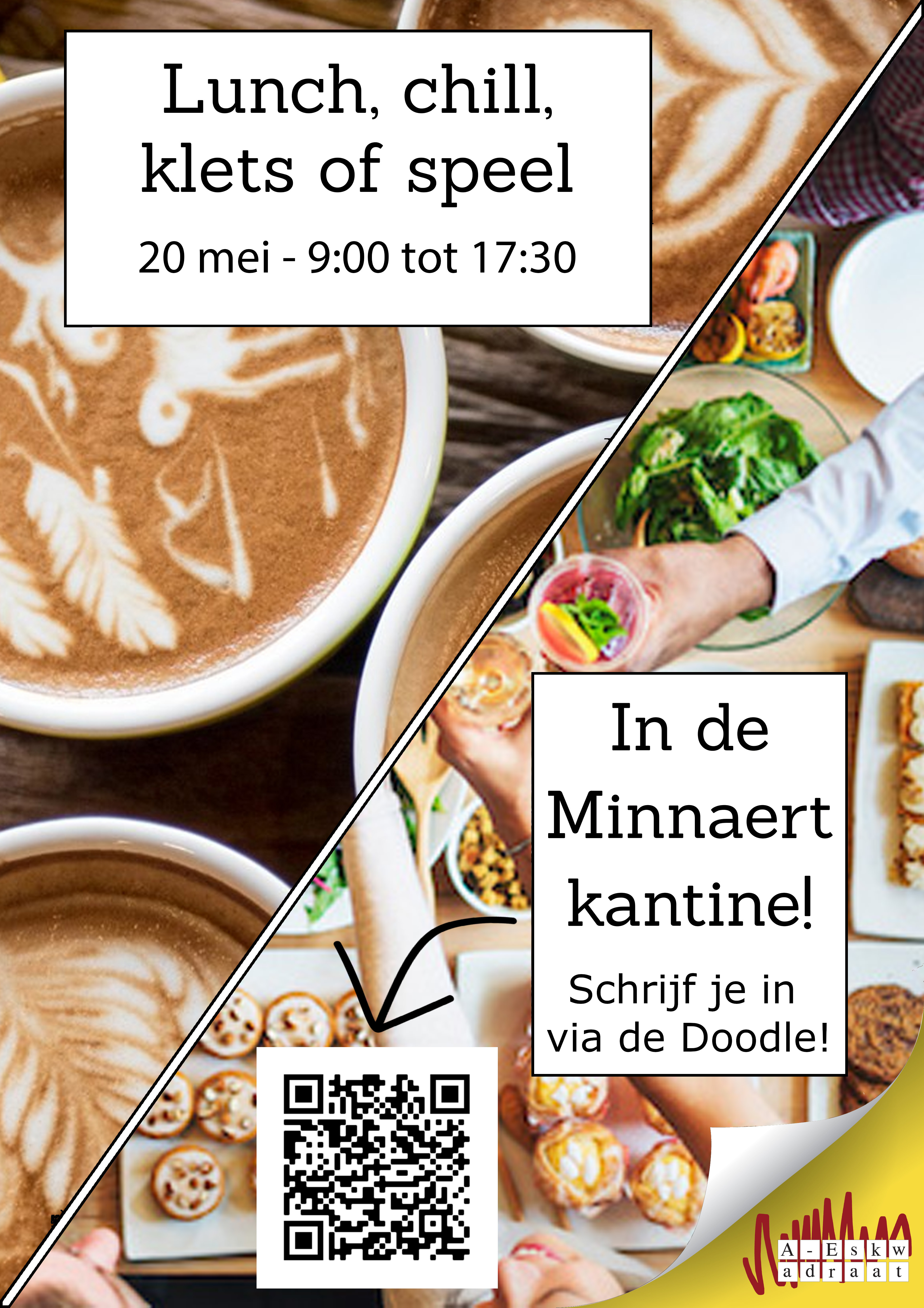 Come lunch, hang out, talk or play a (corona-proof) game with us in the Mezzanine! Sign up via the doodle for the time slots in which you want to stop by. You can do so via the following link: https://doodle.com/poll/ctxcer26sr5xzdcm?utm_source=poll&utm_medium=link. There can only be a maximum number of people at the same time, so make sure to sign up in time.