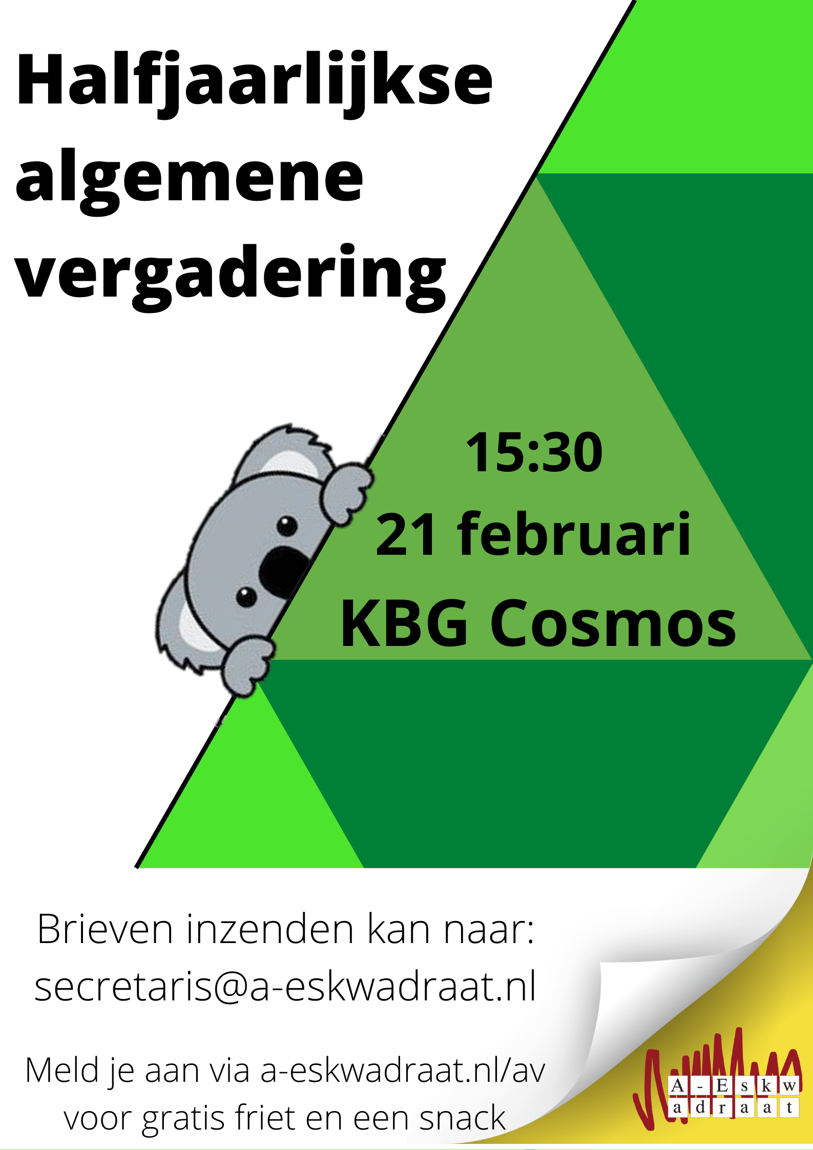 The General Assembly under the 77th board of A–Eskwadraat, 'Leuk geprobeerd' will take place. At this meeting, the board will present its policy update and a budget update.