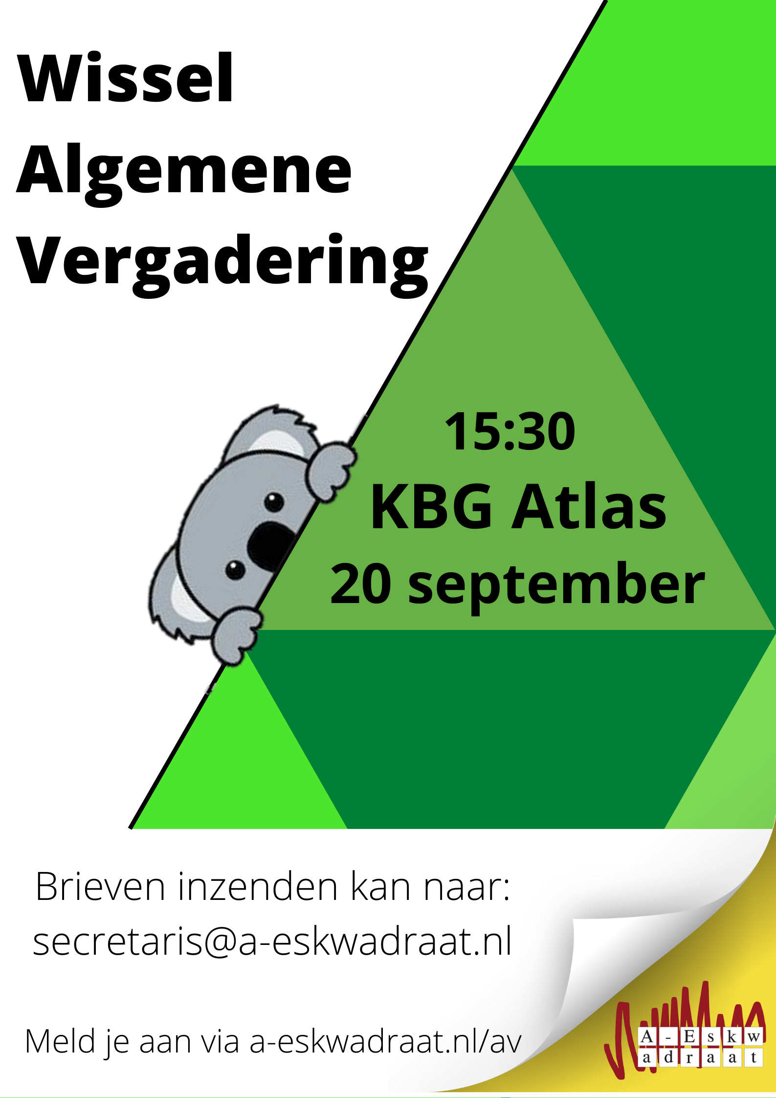De vergadering wordt om 15:30 uur geopend in KBG Atlas. Het AV-uitlegkwartiertje zal om 15:15 beginnen.