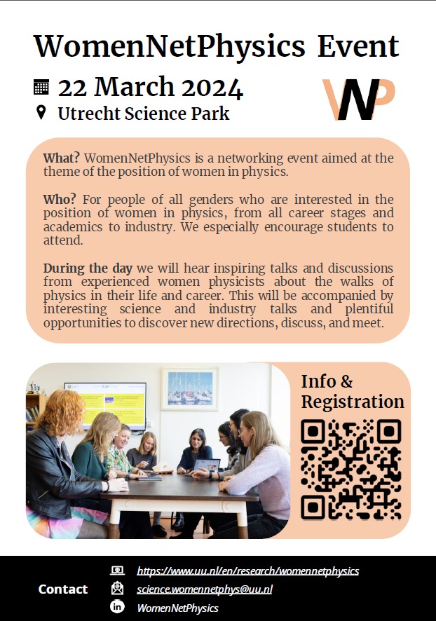 On 22 March 2024, Utrecht University will host WomenNetPhysics; the first women in physics conference in the Netherlands. This network event will gather all that are interested in the position of women in physics, ranging from different stages in their careers and research fields. Get ready to be inspired!