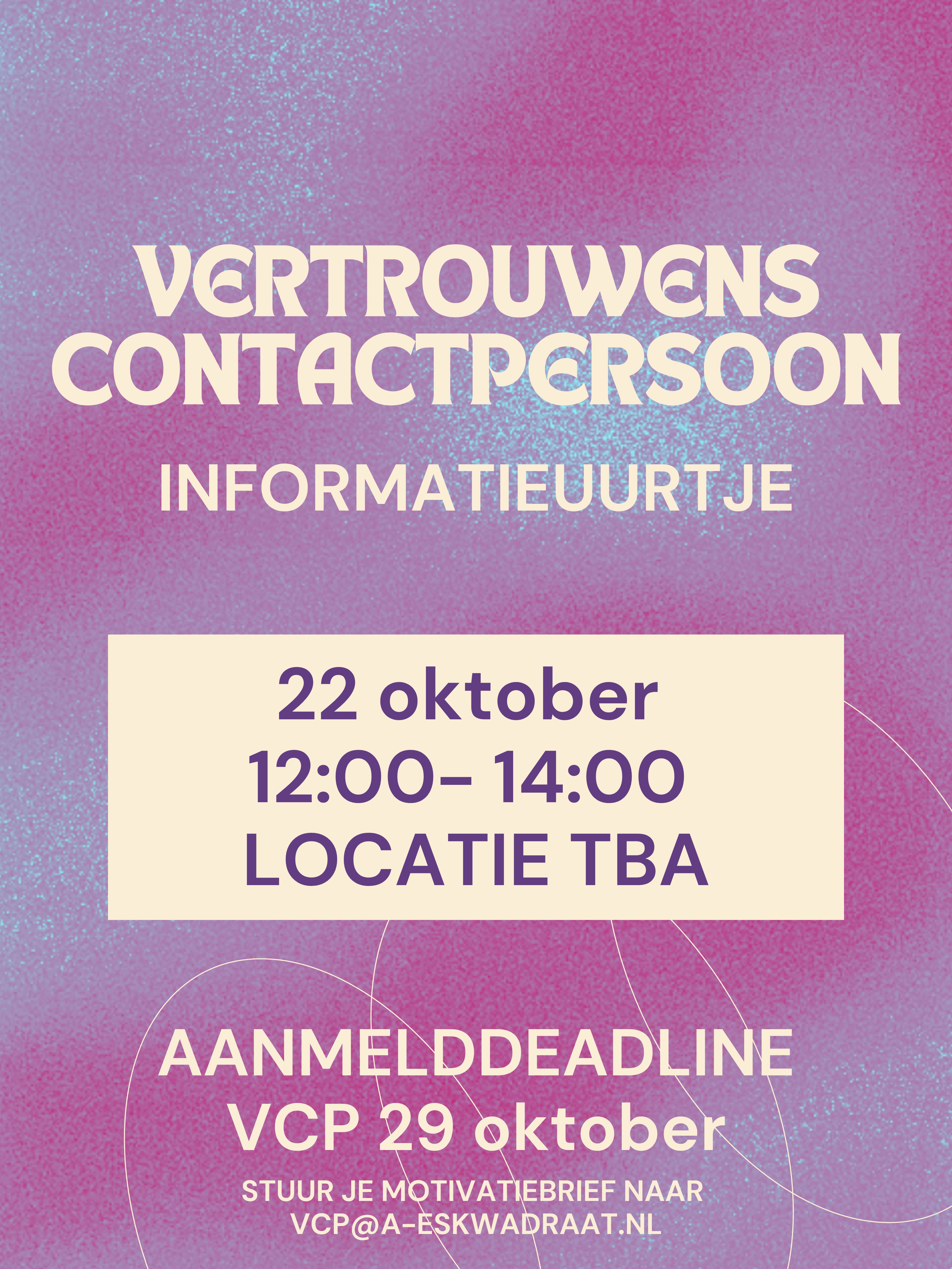 Bij A–Eskwadraat hebben we sinds een aantal jaar 2 vertrouwenscontactpersonen, Morris Philippens en Lara Timmers. Afgelopen jaar heeft Morris besloten het stokje door te willen geven aan iemand anders. Daarom zijn we hard op zoek naar een masculien persoon (m/x) die de nieuwe vertrouwenscontactpersoon voor A–Eskwadraat zou willen zijn. Ben je geïnteresseerd en heb je vragen over wat het precies inhoudt en wat er bij komt kijken, kom dan naar het informatieuurtje op 22 oktober tussen 12 en 14.