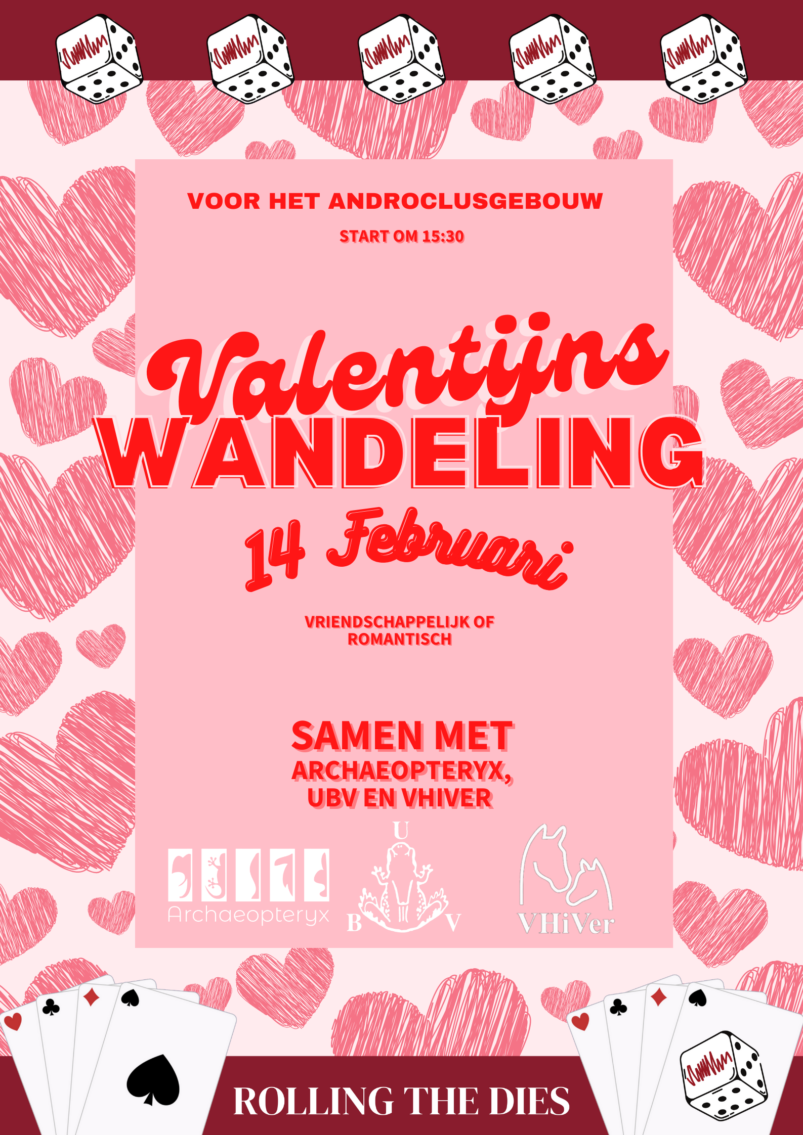 During this walk, you’ll have the chance to find your soulmate, whether in love or as (best) friends. Our Cupids will do their best to pair you with another participant. The walkers come from the study associations A–Eskwadraat, Archeopteryx, UBV, and VHiVer, so there’s plenty of opportunity to match with the one.