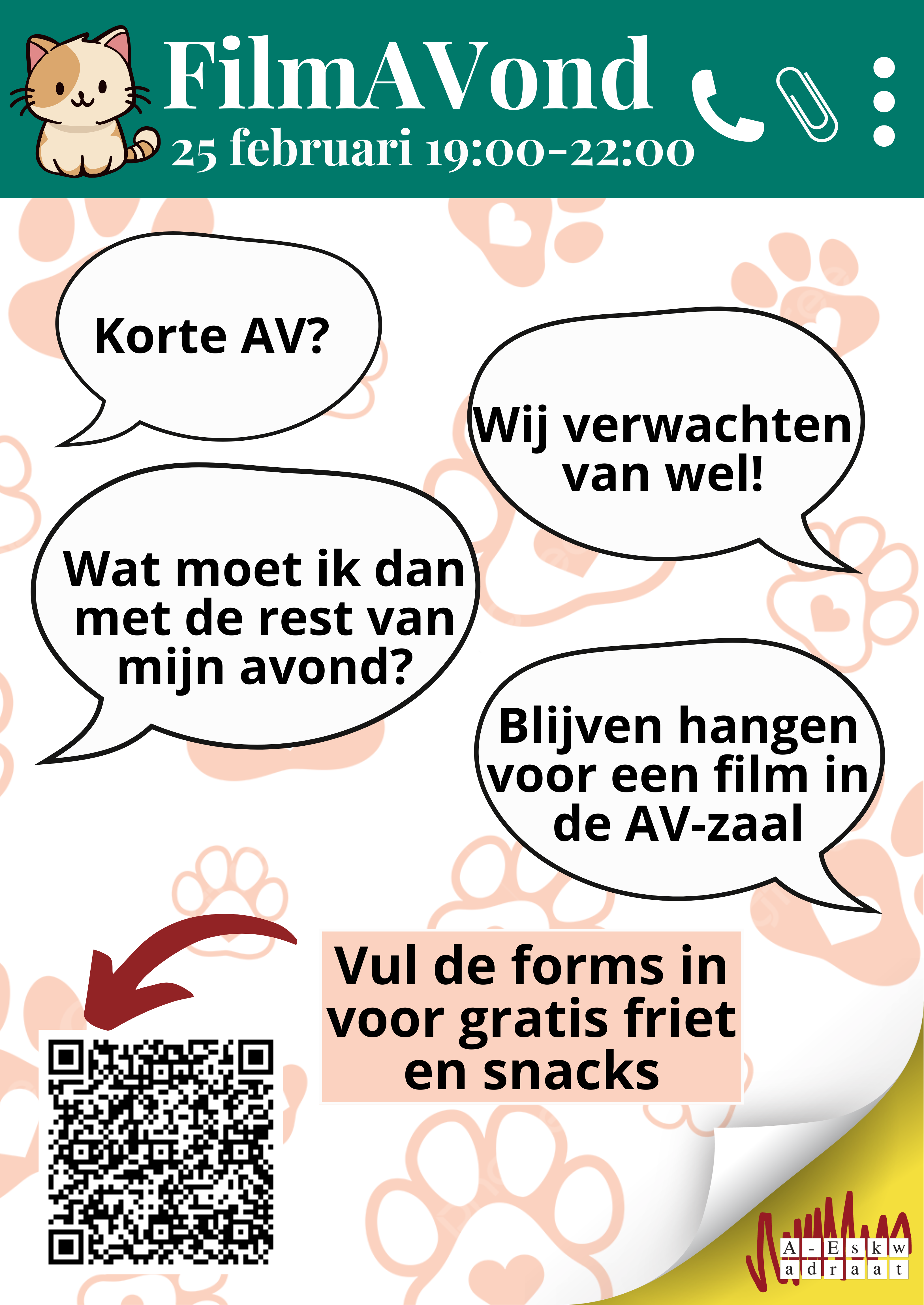 Gezien het waarschijnlijk een korte Algemene Vergadering zal zijn, willen we na afloop in de AV zaal blijven zitten en lekker samen een film kijken. Super leuk zul je denken, maar ik heb dan wel echt avondeten nodig. Gelukkig hebben wij hier aan gedacht! We zullen voor jullie gratis friet bestellen inclusief 1 snack indien je de forms invult. Verder mag je een verzoekje voor een leuke film doen, wij zijn benieuwd! Zien we jou ook bij de AV en na afloop bij de filmAVond?