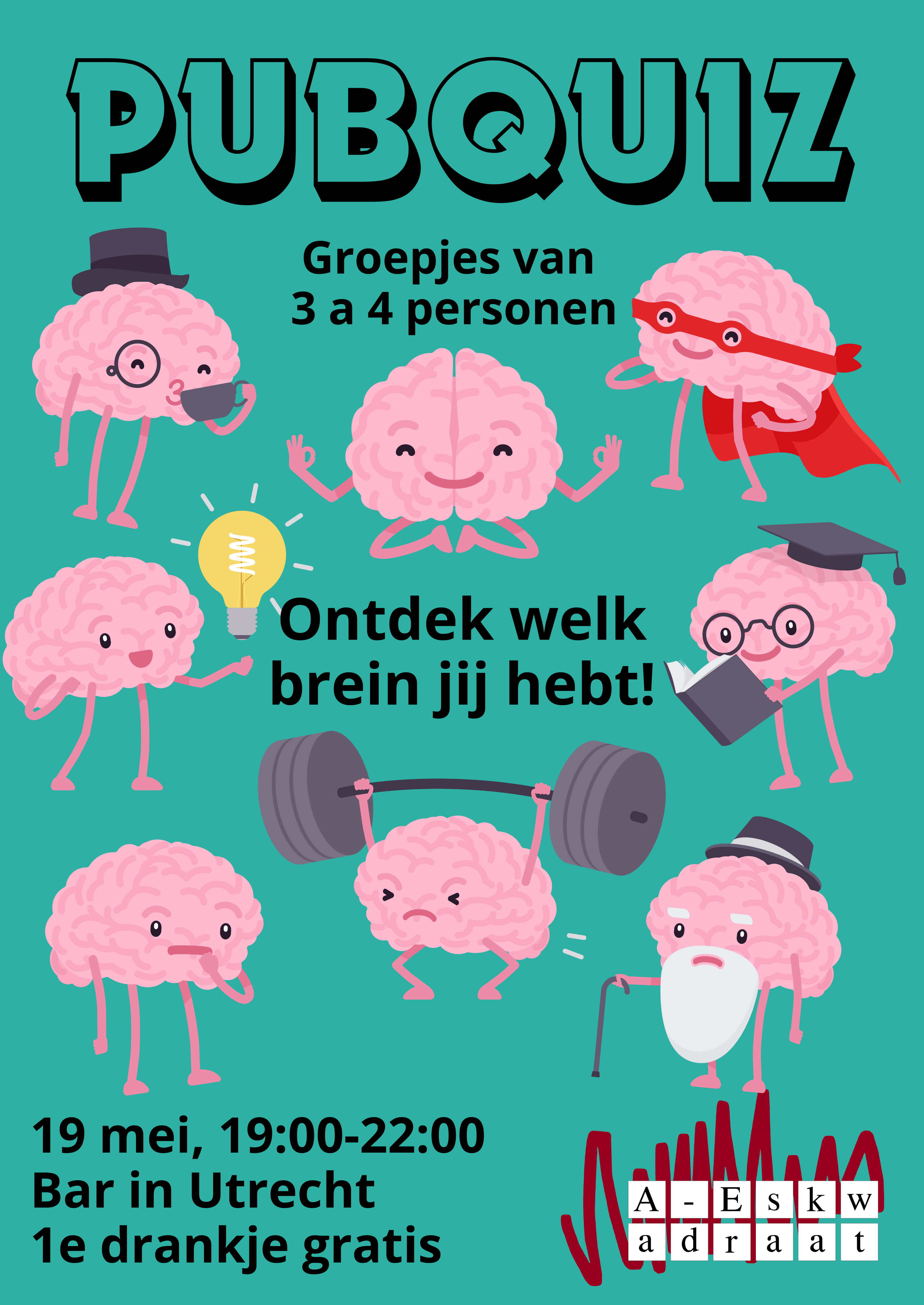 Het is tijd om voor eens en voor altijd te bepalen welk team de beste algemene kennis heeft van A–Eskwadraat. Bij deze pubquiz komen alle soorten vragen wel voorbij en zullen we er dan ook achter komen wat jouw sterke punten zijn. Er valt zeker een prijs te winnen! Vorm je een vriendenteam, of kies je jouw medespelers tactisch uit? Eerste drankje krijg je gratis in Bar Josefien in Utrecht waar deze quiz zal plaats vinden.