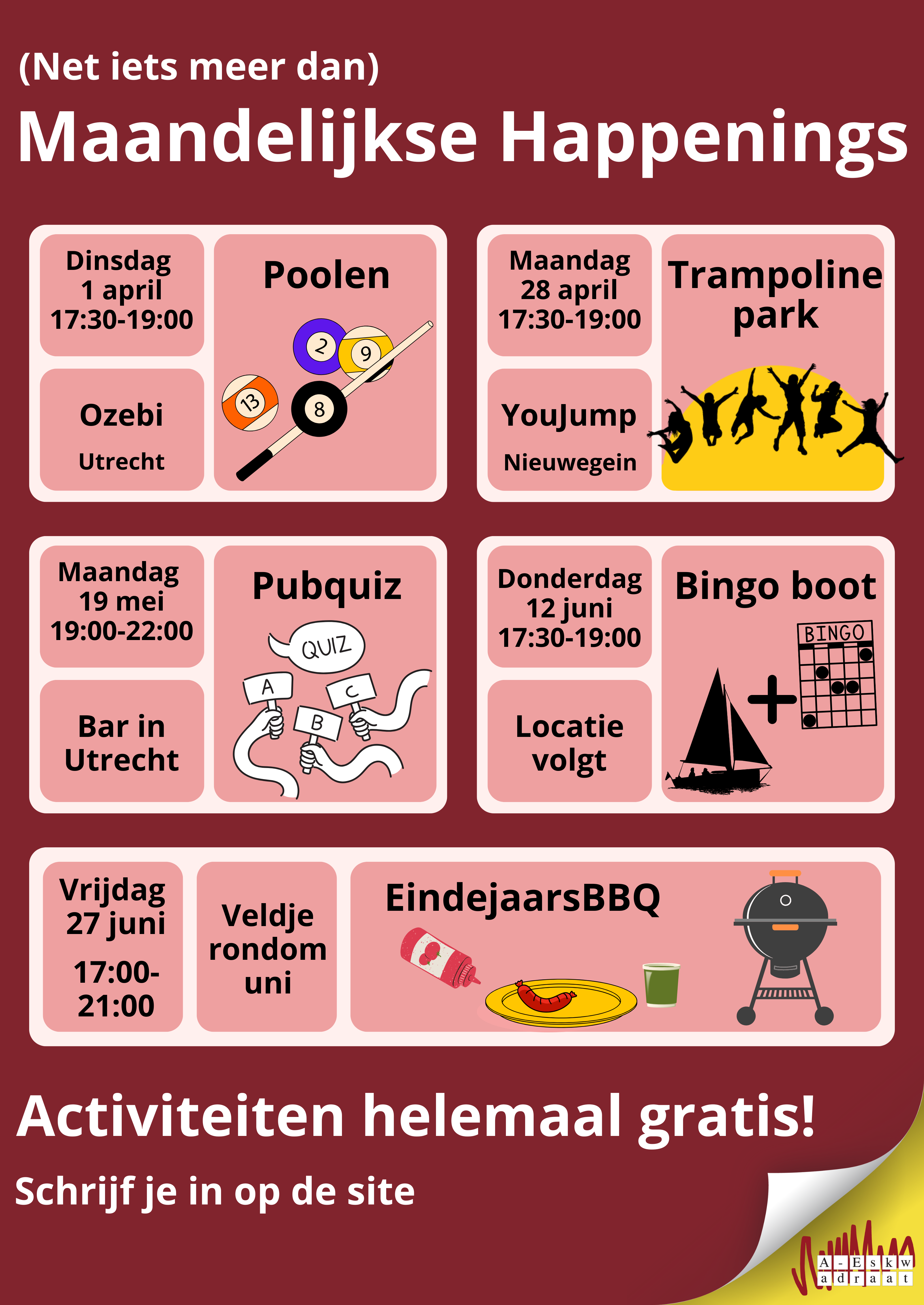 De komende maanden organiseren wij (net iets meer dan) maandelijks hele leuke en zelfs gratis activiteiten! Wegens de verbouwingen zien we elkaar natuurlijk iets minder dan normaal. Dit is dan ook het ideale moment om deze aankomende activiteiten dus vast in je agenda te zetten. Zo hopen we jullie allemaal eens bij een activiteit (of natuurlijk in de Vagant) tegen te komen. Tot dan!