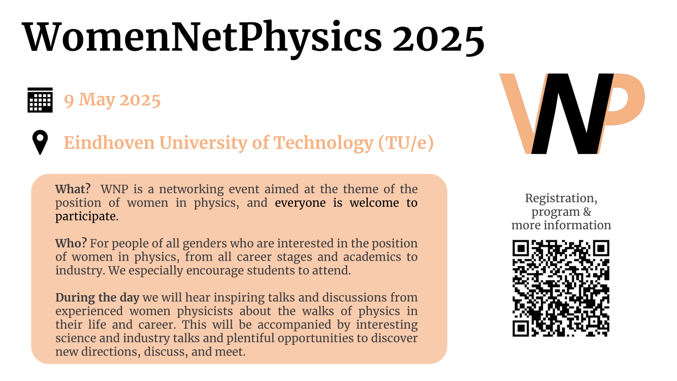 On the 9th of May the Department of Applied Physics of TU/e is organizing the 2nd WomenNetPhysics event in Eindhoven. The WNP event is a networking event open to all physicists and aimed at the theme of the position of women in physics. It features inspiring talks on physics, industry and career and (panel) discussions on a variety of themes. Students are very welcome! The registration deadline is 1st of May and there is no registration fee. The program/registration can be found via the event-page: https://www.tue.nl/en/our-university/calendar-and-events/09-05-2025-womennetphysics-2025