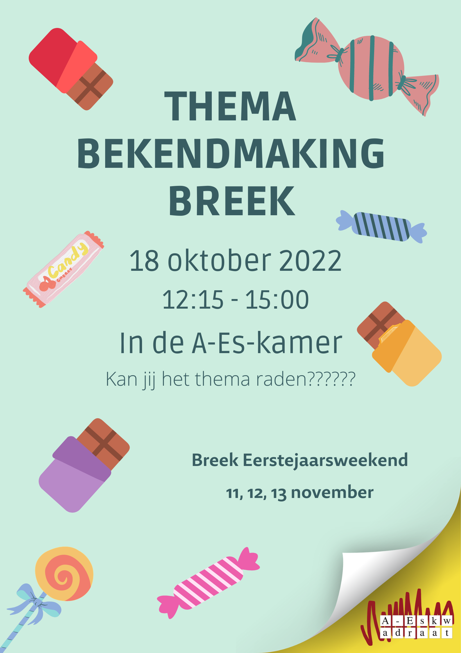 Op dinsdag 18 oktober tussen 12:15 en 15:00 wordt het thema bekendgemaakt van de superleuke ultragave breek. Er zijn snoepjes en er is chocolade! Kan jij het thema raden????? Kom vooral langs!!