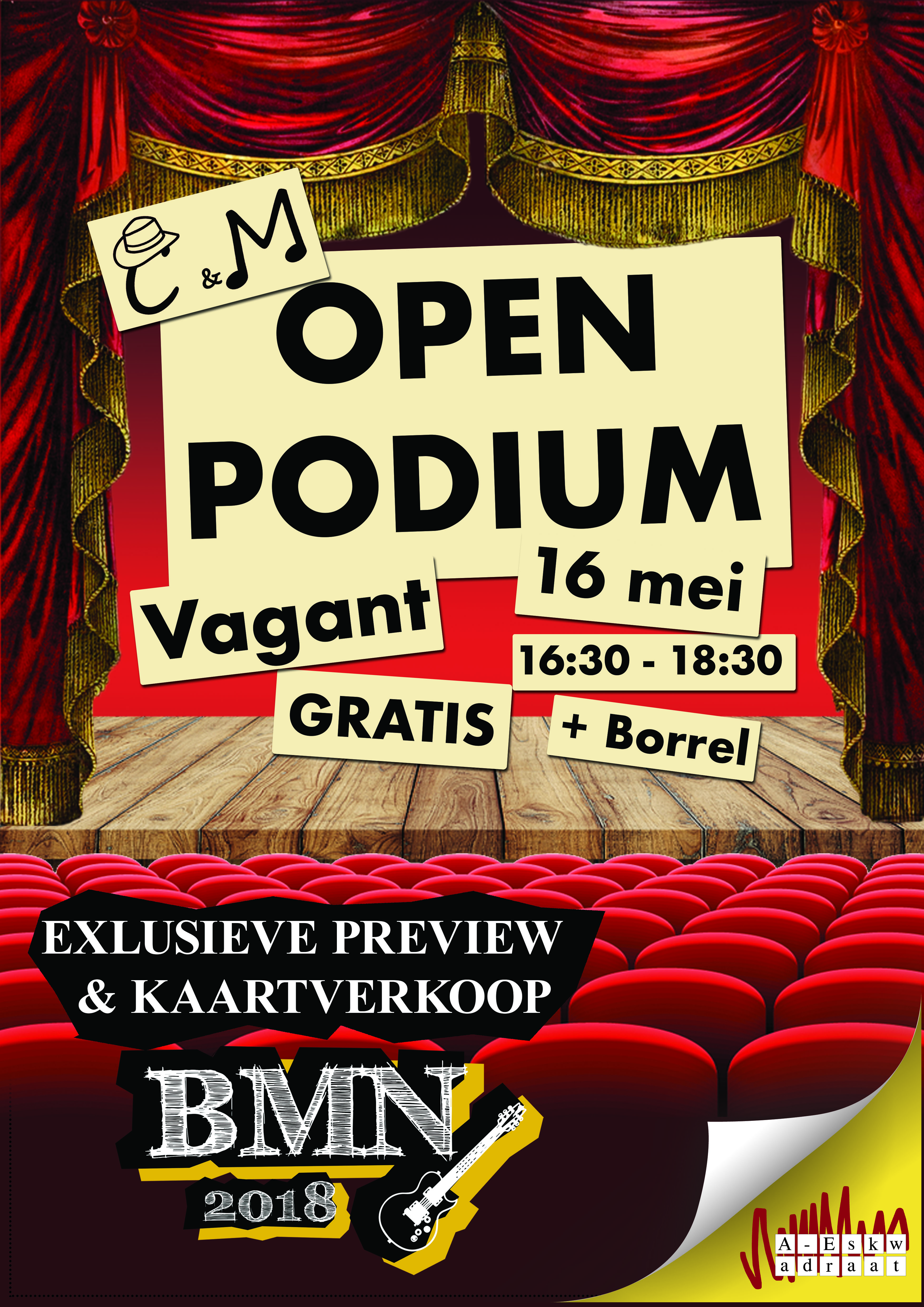 16th of may: Open Mic! Your fellow A-Eskwadraat members will show their talents on the stage, but they won't make it without you: the audience! Stop by for some quality entertainment and drinks. This will be an afternoon to remember.