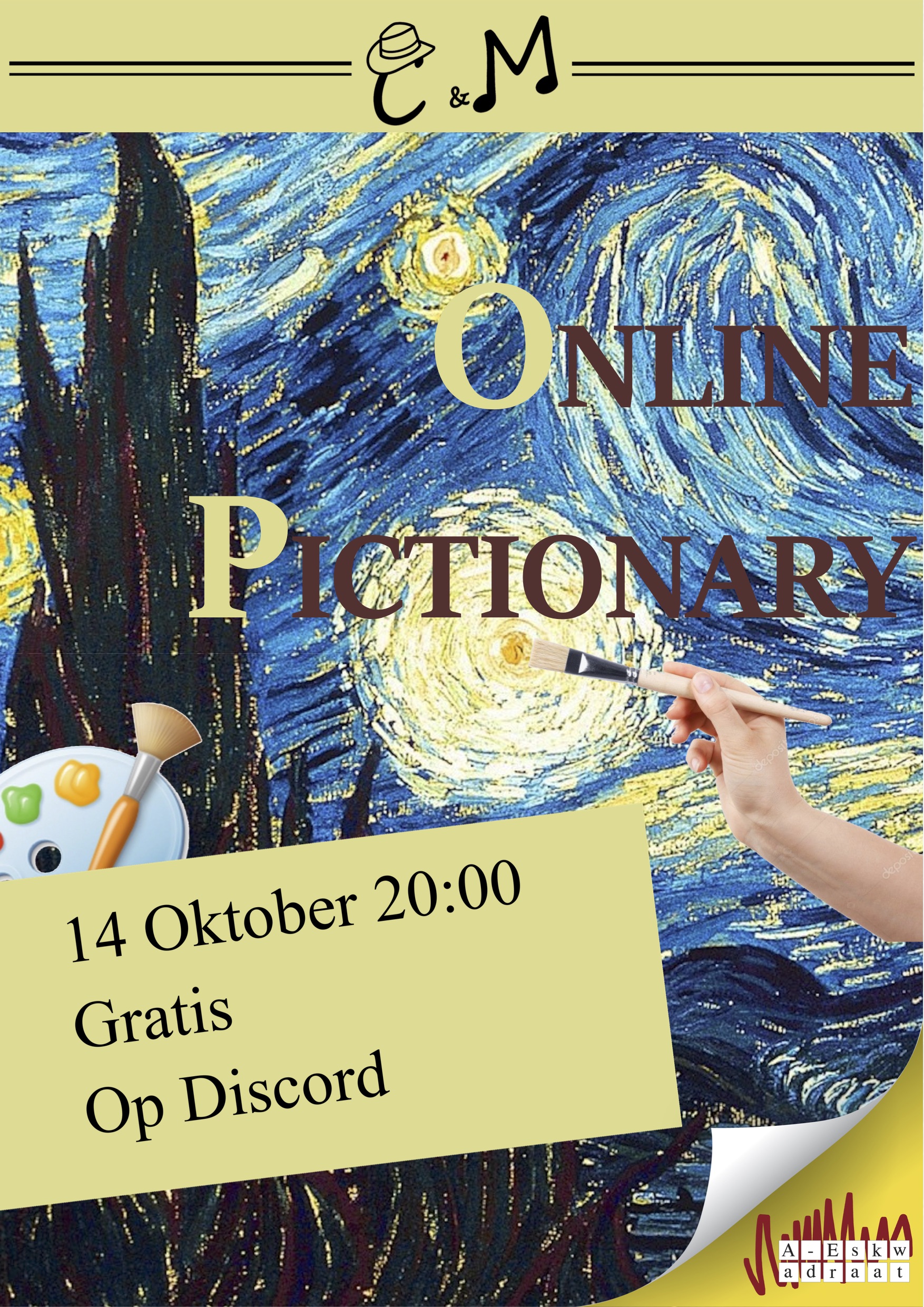 Teken en raad de beroemdste schilderijen in deze Online Pictionary. Het vind plaats op 14 oktober via de Aeskwadraat Discord en het begint om 20:00.
