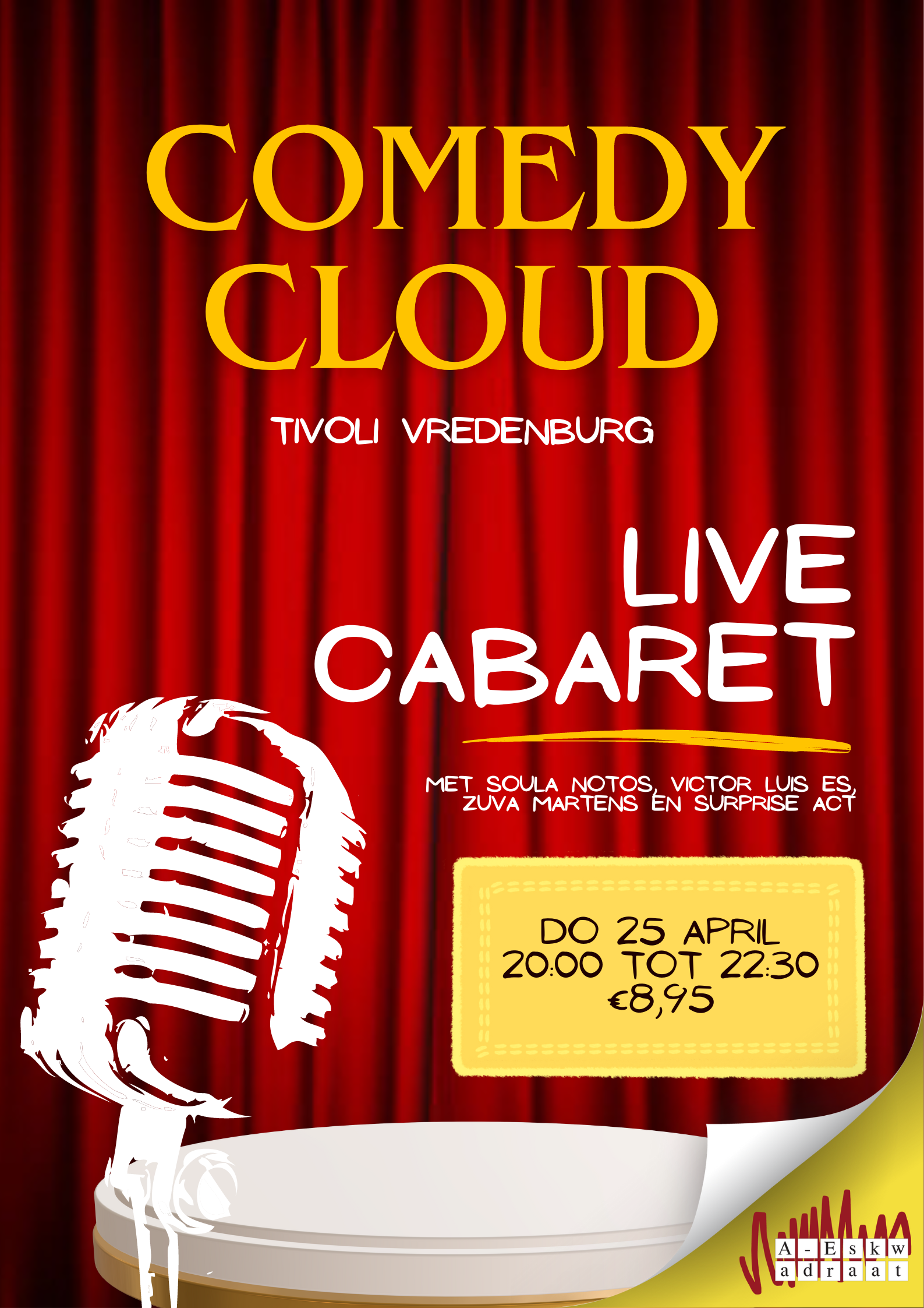 De kaartjes van de ComedyCloud zijn nu te koop via deze link: https://www.a-eskwadraat.nl/Activiteiten/cenm/9477/ComedyCloud/KaartjeKopen