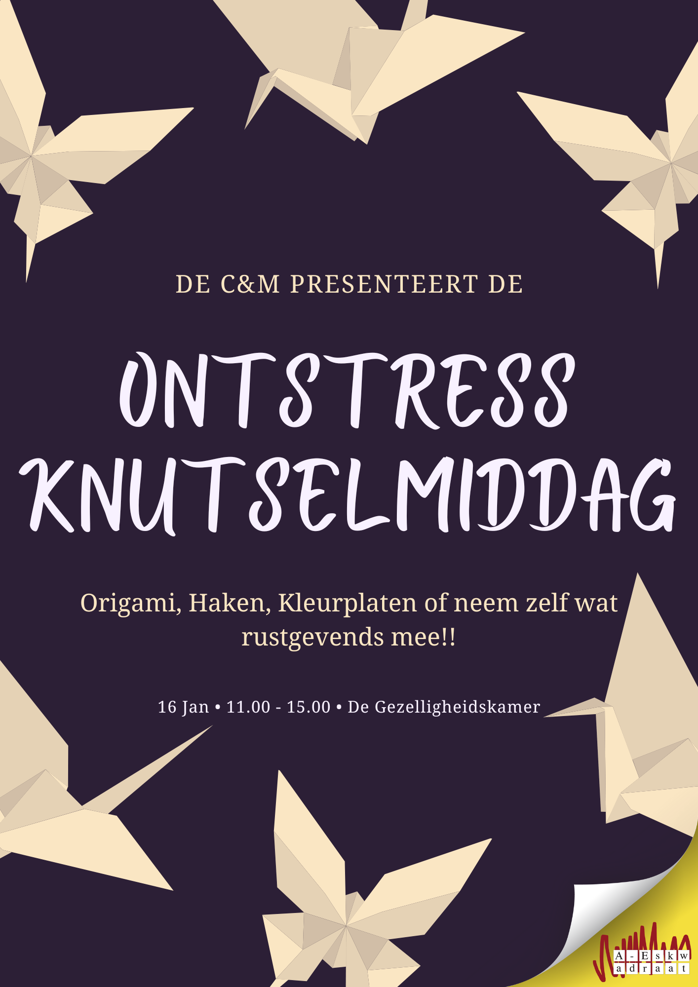 De vakantie is nog maar net voorbij en de tentamens staan alweer voor de deur... HELP! Maar geen zorgen, de C&M staat voor je klaar. Kom langs voor een ontspannende middag en ontdek hoe creativiteit je kan helpen weer helemaal zen te worden! ✨