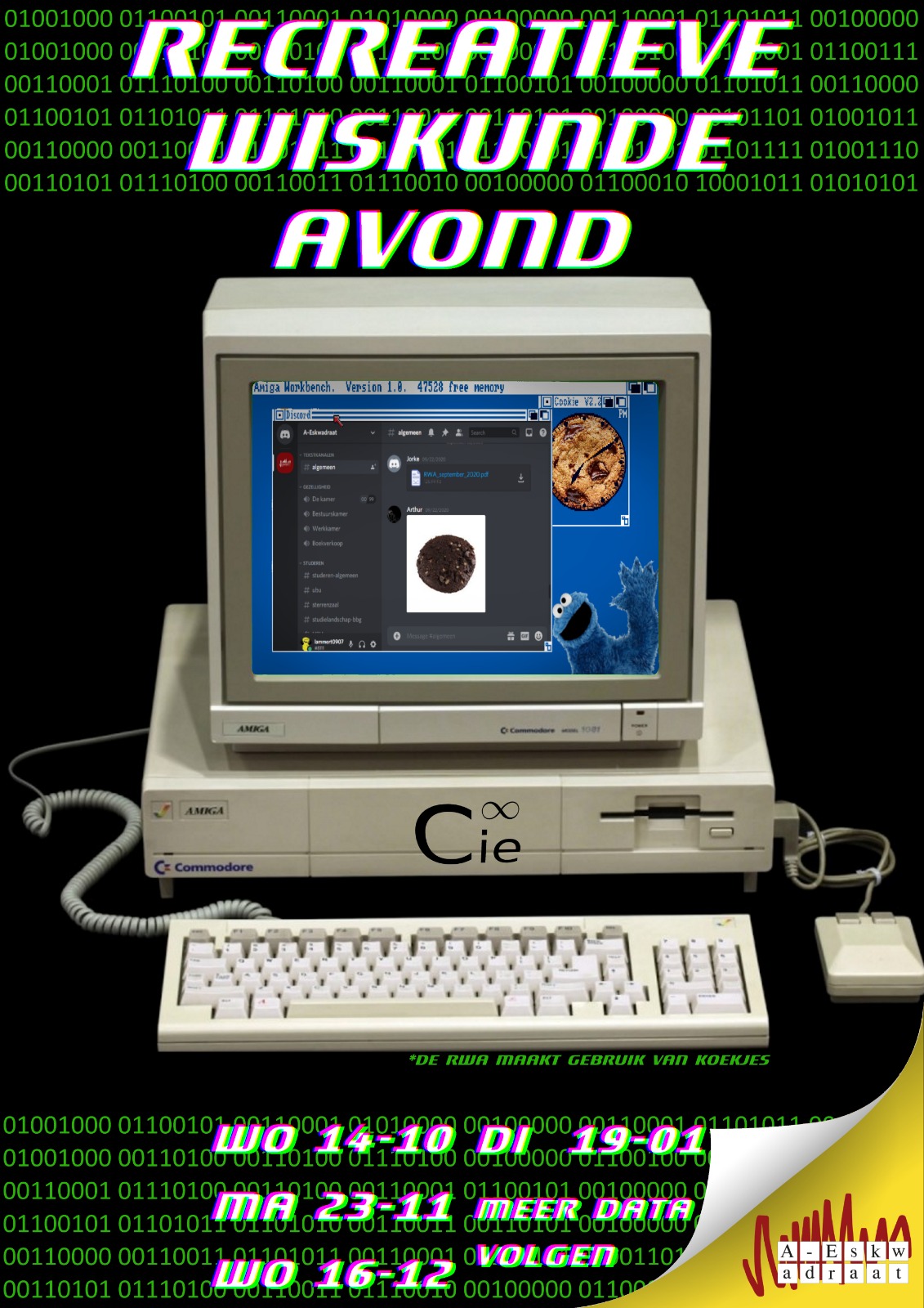 Het idee dat wiskunde niet alleen nuttig hoeft te zijn, maar dat je ook leuke wiskunde kan doen puur en alleen omdat het leuk is, is bijna 4000 jaar oud en bedacht door de Babyloniërs. Om deze oeroude traditie van het doen van recreatieve wiskunde in stand te houden organiseert de Cie-Infinity maandelijks de (Re)creatieve Wiskundeavond. Een avondje samen leuke vraagstukken bekijken, van het soort dat je ook krijgt op wedstrijden zoals de (internationale) Wiskunde Olympiade, de MOAWOA of het IMC. Iedereen is welkom en er zijn vraagstukken van ieder niveau! So join the dork side, we have (online) cookies!