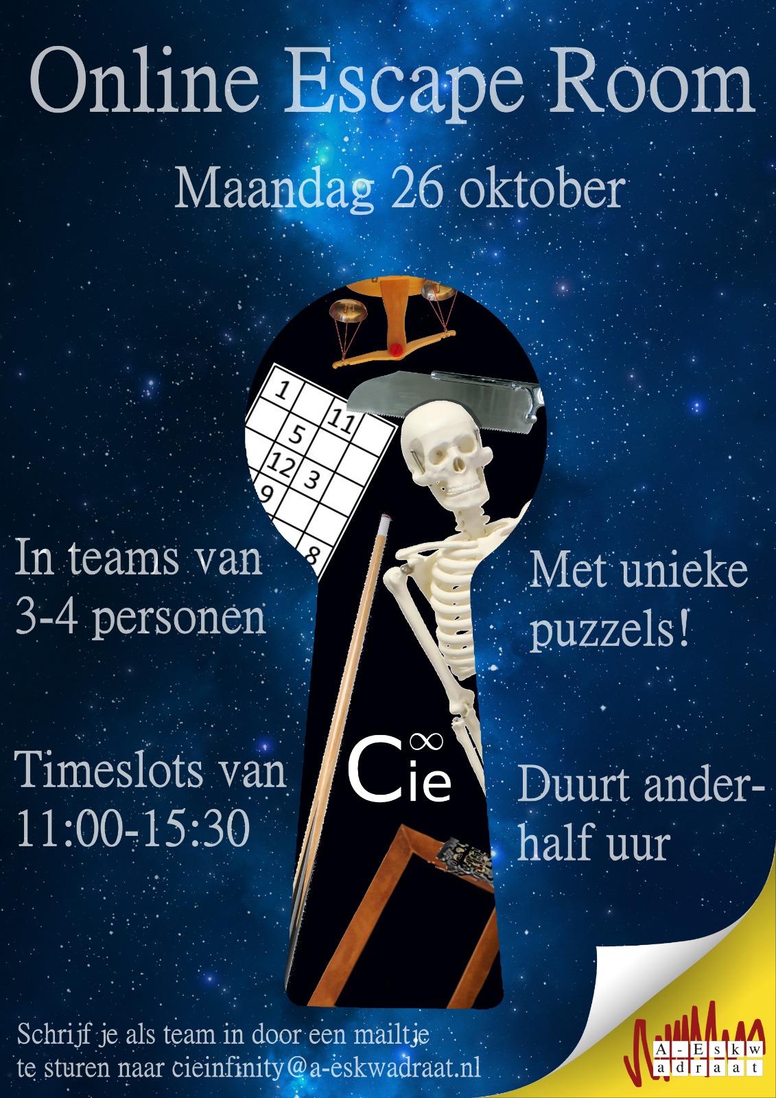 Ontsnap binnen 2 uur samen met 2 tot 3 anderen uit een online ruimte vol puzzels, raadsels en andere (wiskundige) moeilijkheden. Ook geschikt voor eerstejaars!