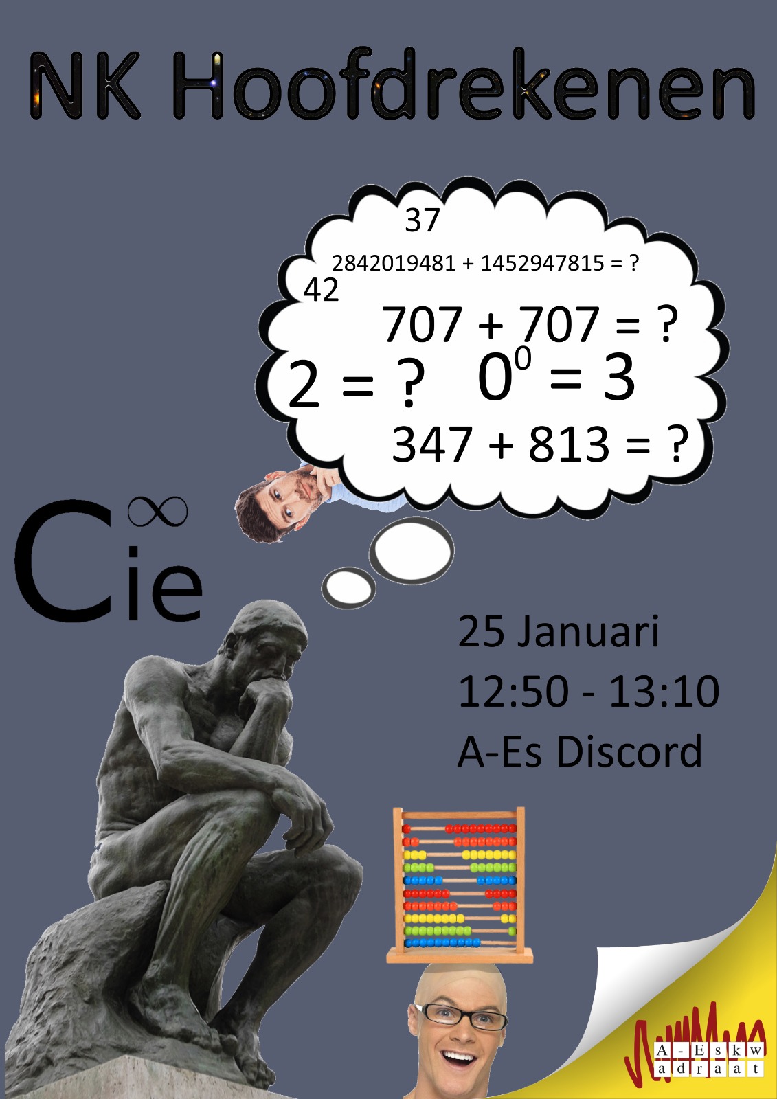We zullen de opgaven dit jaar tussen 12:50 en 13:10 doen in de vorm van een kahoot, waarvoor de code voor deelname te zijner tijd zal worden geplaatst in de A-eskwadraat Discord. Als je hier nog niet in zit, hier is een link: a-es2.nl/discord.