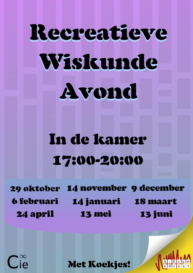Het idee dat wiskunde niet alleen nuttig hoeft te zijn, maar dat je ook leuke wiskunde kan doen puur en alleen omdat het leuk is, is bijna 4000 jaar oud en bedacht door de Babyloniërs. Om deze oeroude traditie van het doen van recreatieve wiskunde in stand te houden organiseert de Cie Infinity maandelijks de (Re)creatieve Wiskunde Avond. Een avondje samen leuke vraagstukken bekijken, van het soort dat je ook krijgt op wedstrijden zoals de (internationale) Wiskunde Olympiade, de MOAWOA of het IMC. Iedereen is welkom en er zijn vraagstukken van ieder niveau! So join the dork side, we have cookies!