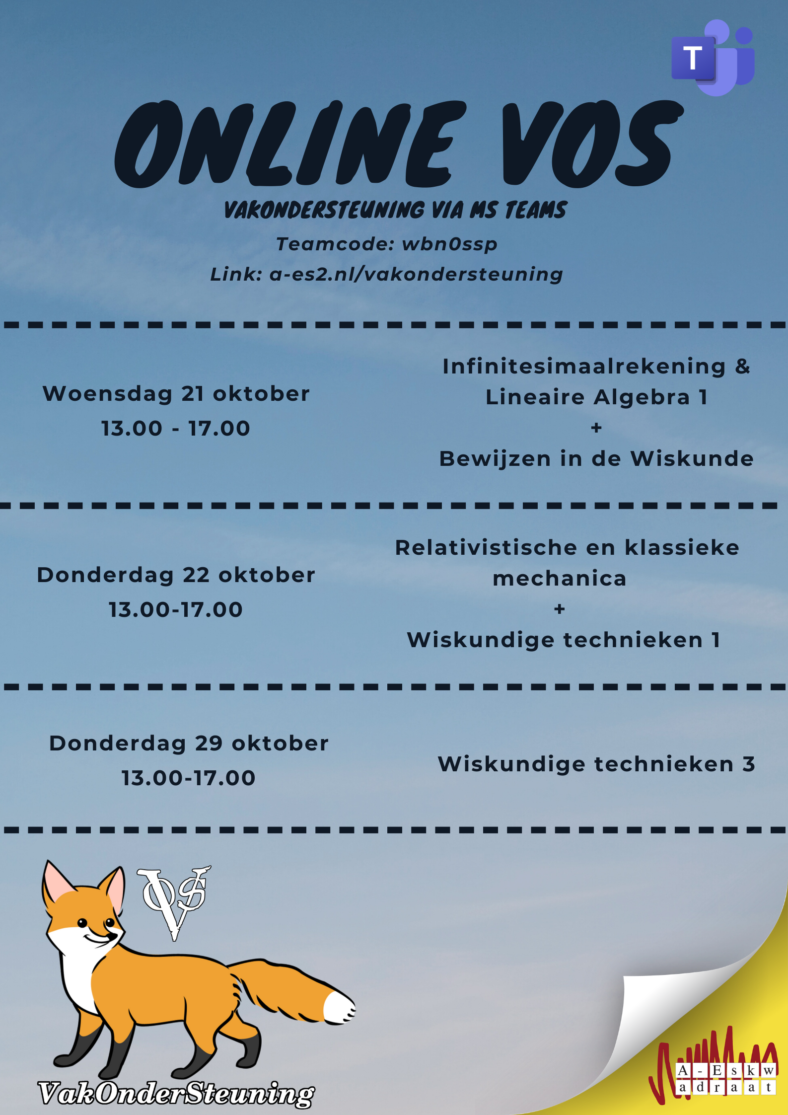 Het einde van het blok komt eindelijk een beetje in zicht, maar daarmee ook helaas de eerste tentamenweek. Volg jij het vak infinitesimaalrekening en lineaire algebra 1 en/of bewijzen in de wiskunde? Kun jij nog wel wat hulp gebruiken? Dan is A-Eskwadraat daar voor jou! We organiseren namelijk een VOS: VakOnderSteuning. Er zijn deze middag ouderejaars aanwezig die je kunnen helpen!