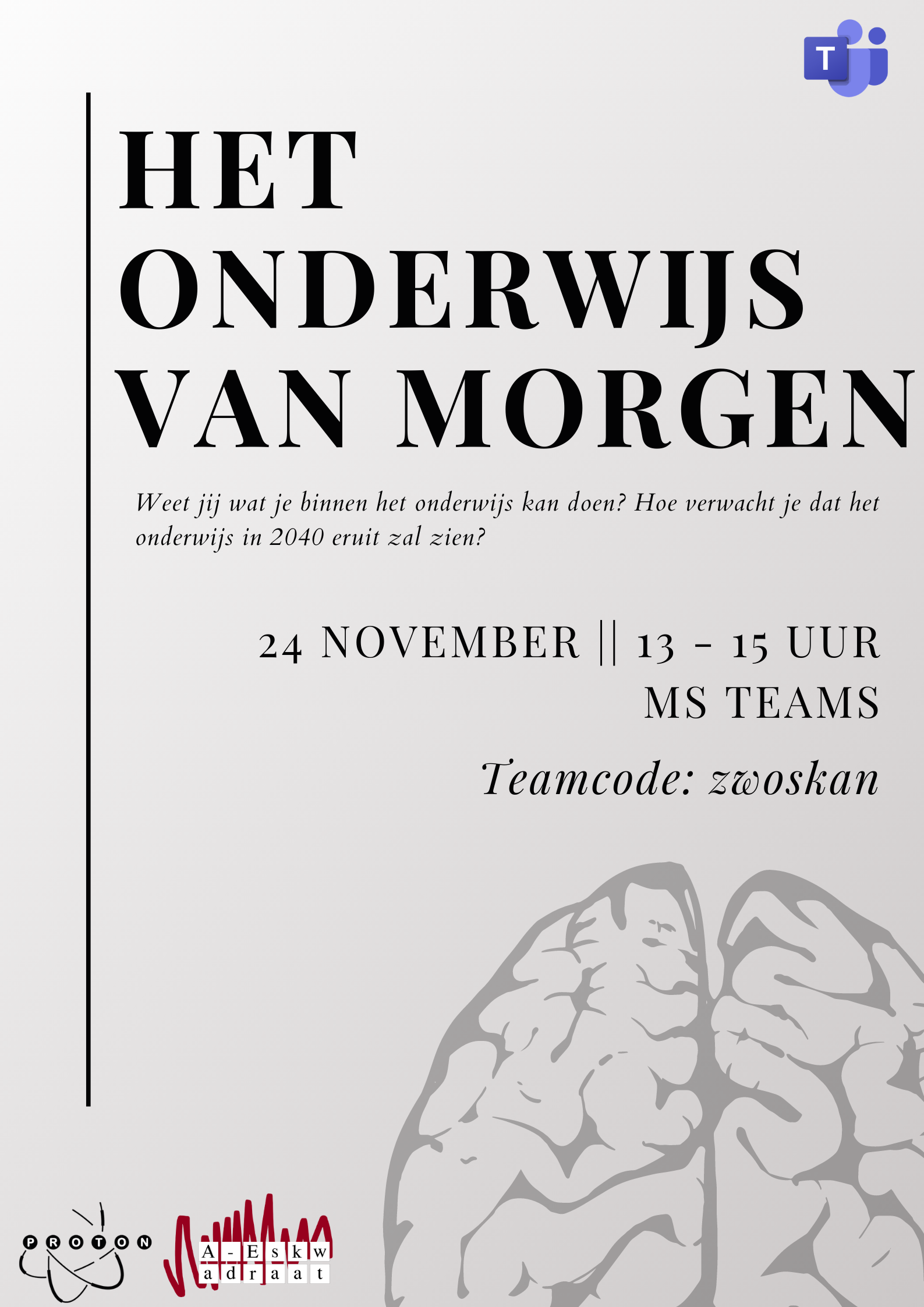Ga deze middag in gesprek met docenten, vakkundige en medestudenten over wat jij binnen het onderwijs kan doen en maak een ontwerp voor de universiteit in 2040! Denk hierbij bijvoorbeeld aan wat er allemaal zal veranderen na de corona pandemie. De middag zal samen met Proton georganiseerd worden, dus de middag zal ook nog eens interdisciplinair zijn!
