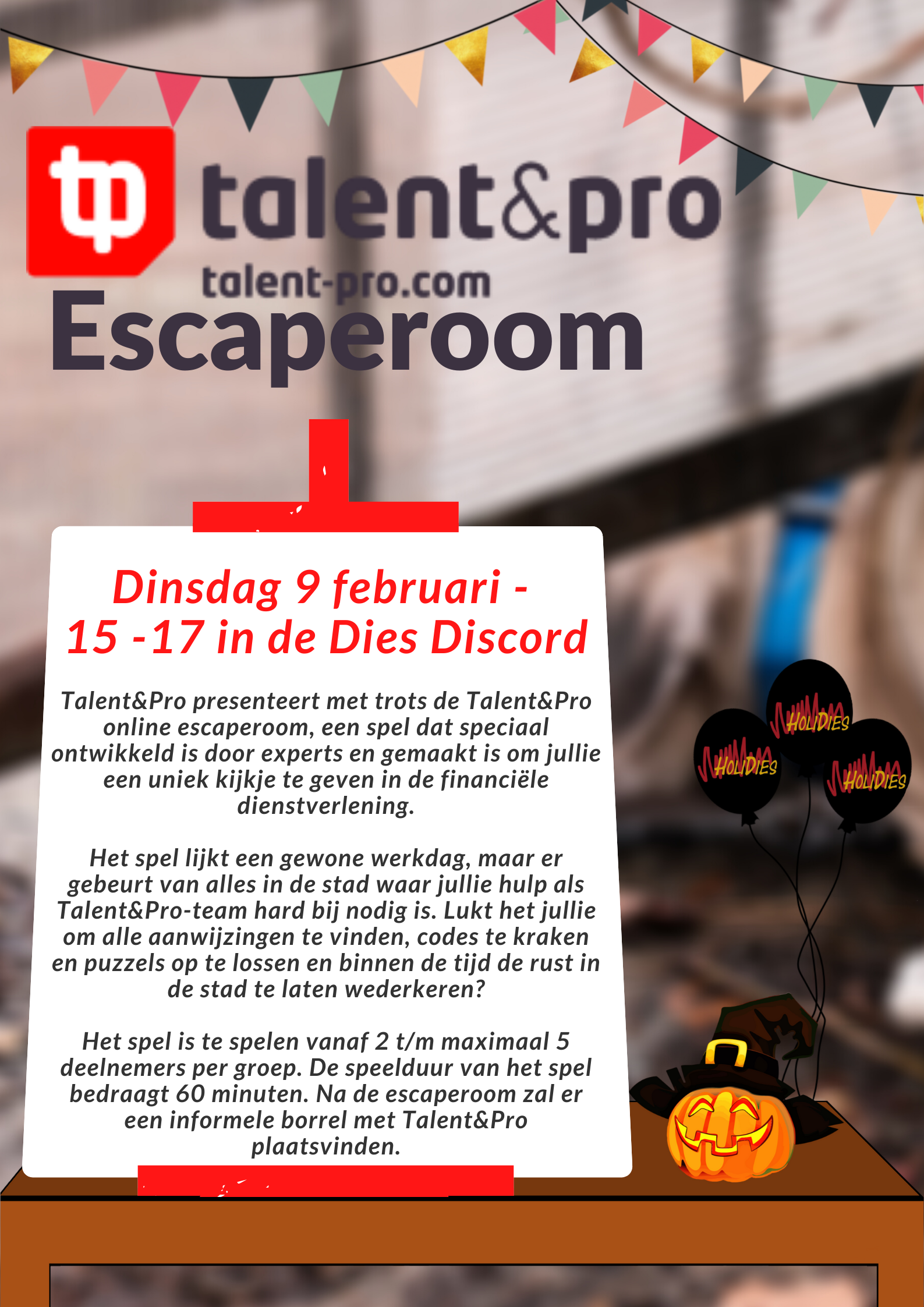Jullie worden vooraf voorzien van alle benodigde informatie om in te loggen in de online escaperoom. Het spel is te spelen vanaf 2 t/m maximaal 5 deelnemers per groep. Je groep krijgt een eigen kanaal toegewezen in de Dies Discord (a-es2.nl/diesdiscord) De speelduur van het spel bedraagt 60 minuten. Na de escaperoom zal er een informele borrel met Talent&Pro plaatsvinden.