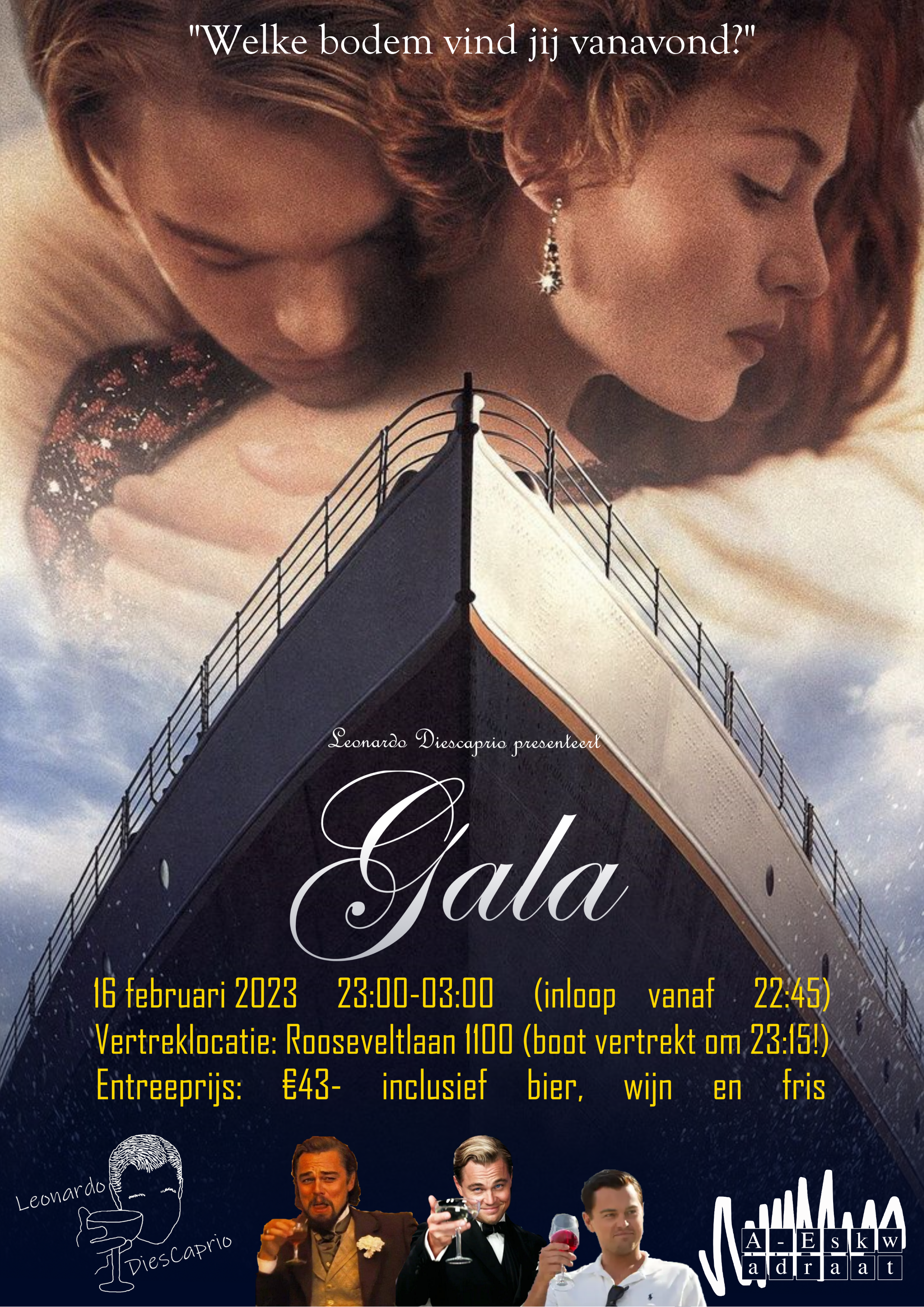 Het gala is dit jaar op Boot 10, dus we gaan varen tijdens het gala! De opstapplek is Rooseveltlaan 1100. De boot gaat varen tussen 23:15 en 03:00. De inloop is vanaf 22:45. De boot vaart om 23:15 WEG, dus zorg dat je er op tijd bent!!! Neem je iemand van buiten A-Eskwadraat mee? Zorg er dan voor dat je een extra kaartje koopt. Goed om te weten: er is onbeperkt bier/fris/wijn bij de prijs inbegrepen :)