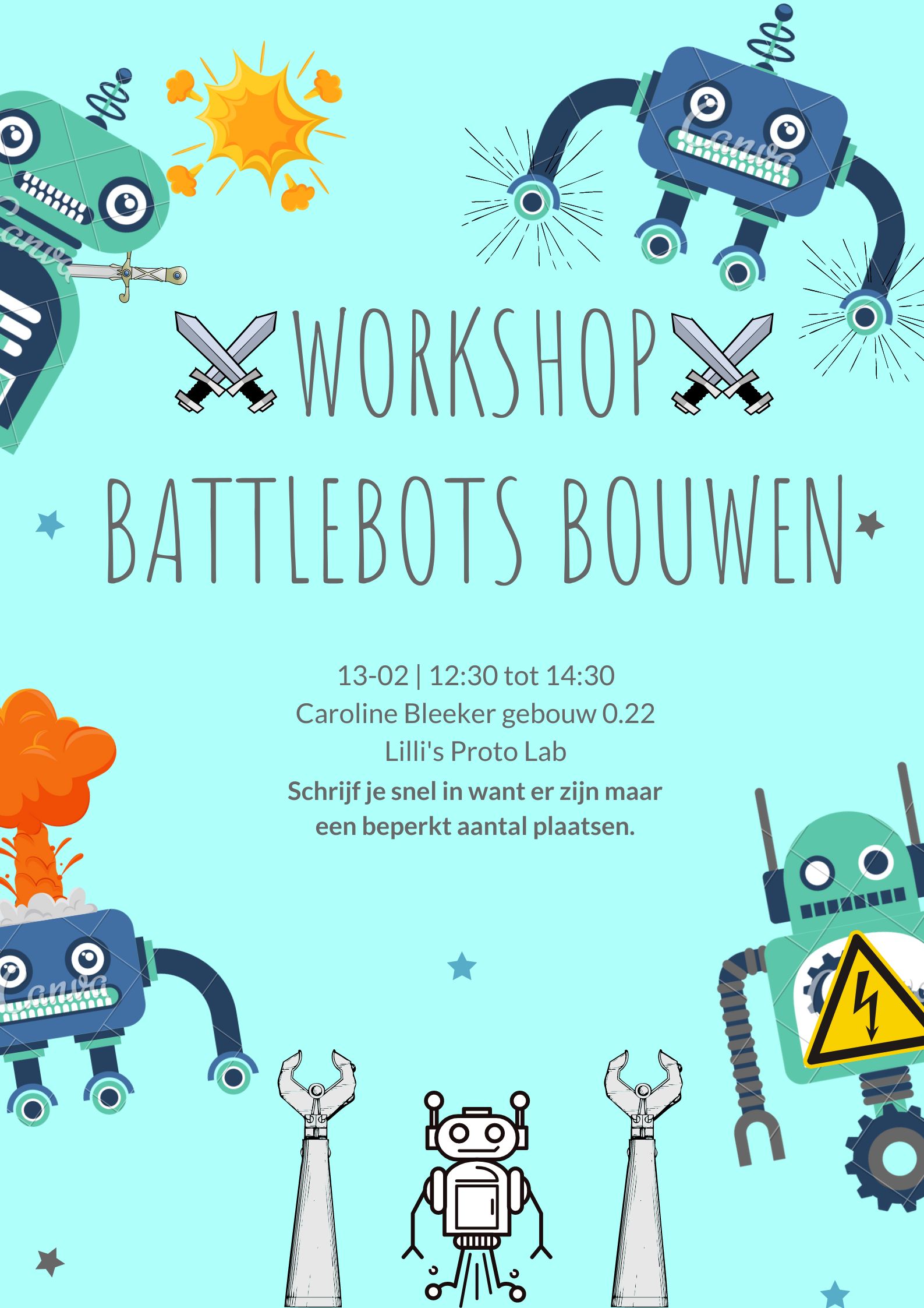 Kom mee leren hoe je battlebots bouwt bij Lili's Protolab! Super handig als je vast zit in de wildernis en zelf niet zo goed kan vechten. Het is gewoon op de Uithof, dus je hoeft niet ver te fietsen.