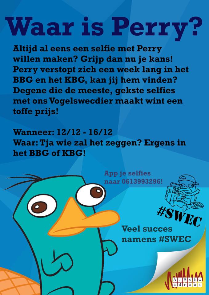 Perry zal zich een week lang op verschillende plekken in het BBG en KBG verstoppen. Weet jij waar hij is? Stuur dan een selfie met Perry naar onze perrymeester. Degene die het vaakst en op verschilende plekken met Perry op de foto staat wint een leuk prijsje.