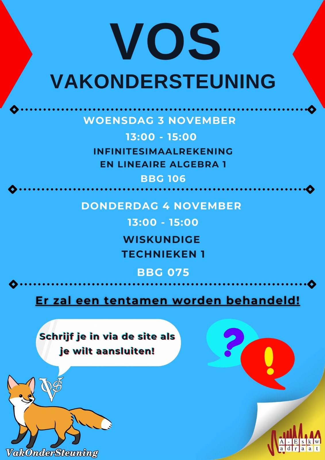 Het einde van het blok komt eindelijk een beetje in zicht, maar daarmee ook helaas de eerste tentamenweek. Volg jij het vak wiskundige technieken 1? Kun jij nog wel wat hulp gebruiken? Dan is A-Eskwadraat daar voor jou! We organiseren namelijk een VOS: VakOnderSteuning. Er zijn deze middag ouderejaars aanwezig die je kunnen helpen!