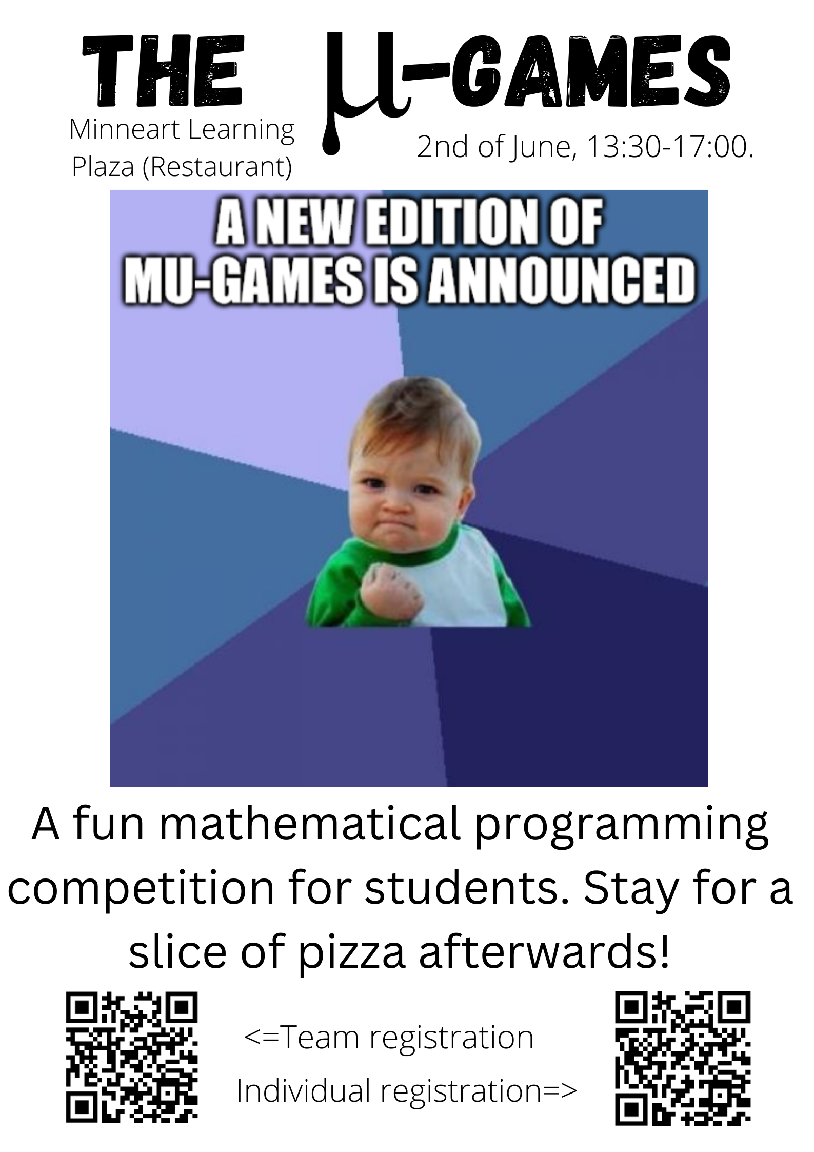 The seventh edition of the μ-Games (Mathematics Utrecht) will take place on Friday 2 June, 13.30-16.30, in the Minnaert Learning Plaza. This will be a friendly programming contest focused on mathematical thinking. For all problems you must first think mathematically and then write a short program to calculate the answer. The exercise sheet will also include problems aimed at bachelor's students. You can sign up in a team of 3 or 4 students, or individually. In the latter case, we will match you with a few fellow students. During the competition you can program in C#, Java and Python. The event will take place on site, but can also be joined online if you cannot make it on site. Afterwards, we will order pizza for those students that want to discuss the exercises. If you have questions you can find information at our website https://clover.science.uu.nl/ or you can reach us at: [email protected]. Sign up as a team, or as an individual. Hope to see many of you there!