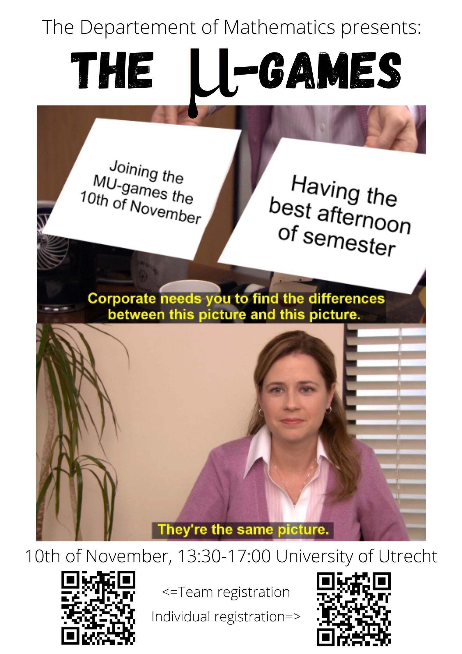 The next edition of the μ-Games (Mathematics Utrecht) will take place on Friday 10 November, 13.30-16.30, in the Minnaert Learning Plaza. This will be a friendly programming contest focused on mathematical thinking. For all problems you must first think mathematically and then write a short program to calculate the answer. The exercise sheet will also include problems aimed at bachelor's students. You can sign up in a team of 3 or 4 students, or individually. In the latter case, we will match you with a few fellow students. During the competition you can program in C#, Java and Python. The event will take place on site, but can also be joined online if you cannot make it on site. Afterwards, we will order pizza for those students that want to discuss the exercises. If you have questions you can find information at our website https://clover.science.uu.nl/ or you can reach us at: [email protected]. Sign up as a team, or as an individual. Hope to see many of you there!
