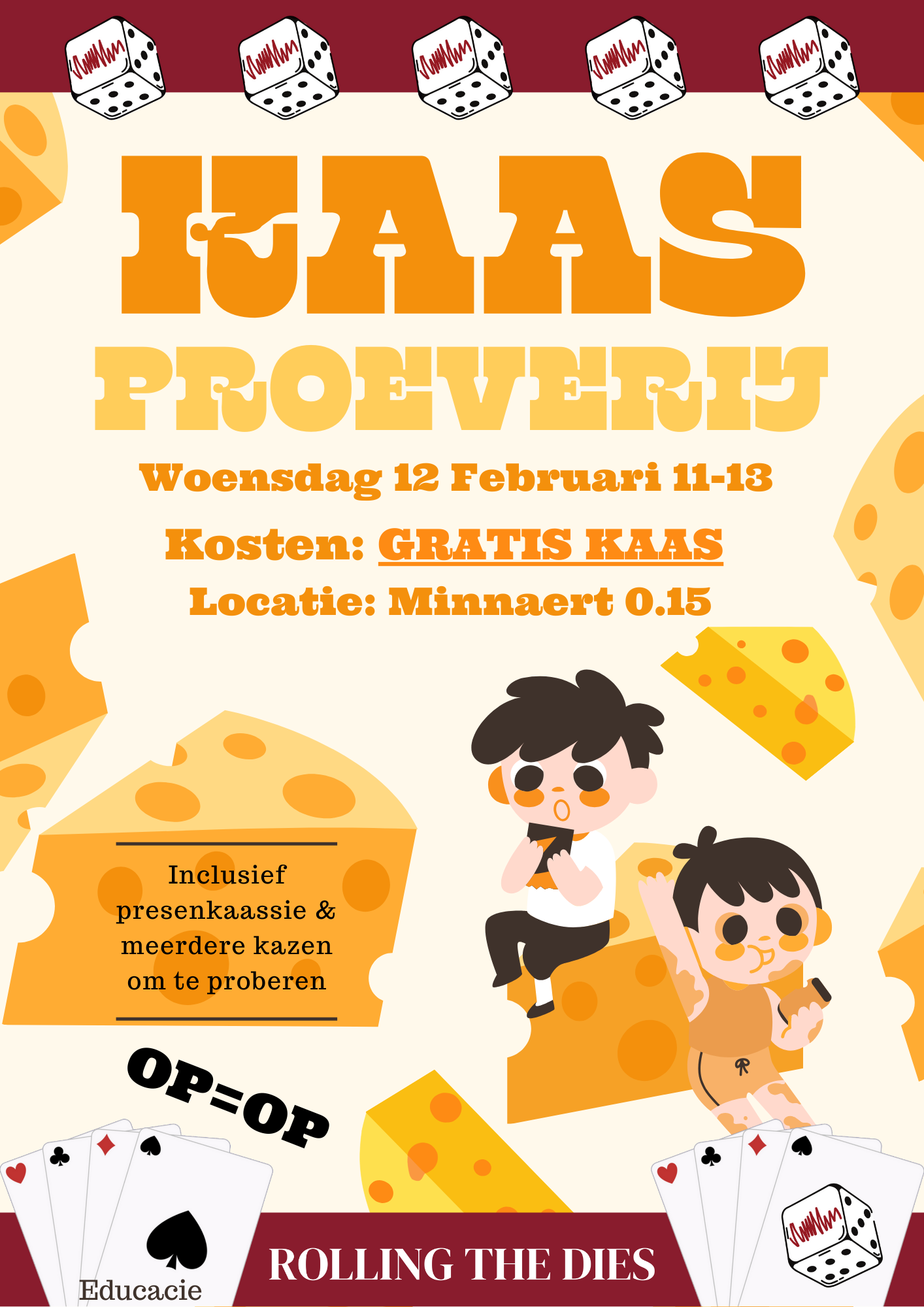 Hoi! Houd jij van kaas? Houd jij ook van GRATIS KAAS? Mooi! Kom je kaashorizon verleggen met de enige echte kaas-commissie; de edukaassie! Mocht je van al je wis & natuurkunde colleges geen kaas gegeten hebben, dan komt dat mooi uit want hier kan je wel kaas eten! Je kan bij ons allerlei soorten kaas proberen onder begeleiding van een uiterst professionele presenkaassie! Wees er snel bij want OP=OP
