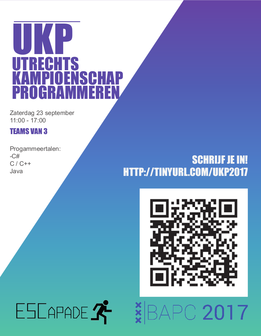 The UKP is a programming contest, which means you will receive a number of assignments which you are to complete by writing a computer program. The UKP is a preliminary of the BAPC (Benelux Algorithm Programming Contest), which precedes the NWERC (North-West European Regional Contest), which is part of the ICPC (International Collegiate Programming Contest).