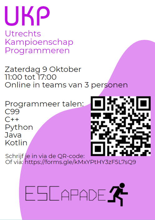 Het Utrechts Kampioenschap Programmeren (UKP) komt er weer aan! Dit is de voorronde voor de Benelux Algorithm Programming Contest (BAPC). Tijdens het UKP krijgen teams van drie studenten een aantal uur de tijd om een aantal lastige programmeer problemen op te lossen. De programmeer talen waarin je de problemen mag oplossen zijn: C99, C++ (versie 14 of hoger), Python (versie 3), Java (versie 11 of hoger) en Kotlin (versie 1.3). De teams die dit het beste doen winnen een plaatsing voor het BAPC dat dit jaar op 30 oktober zal plaatsvinden. Vanwege het coronavirus zal het UKP dit jaar (hopelijk voor de laatste keer) online zijn. Lijkt het je leuk om mee te doen aan het UKP? Schrijf je dan nu in via de onderstaande link: