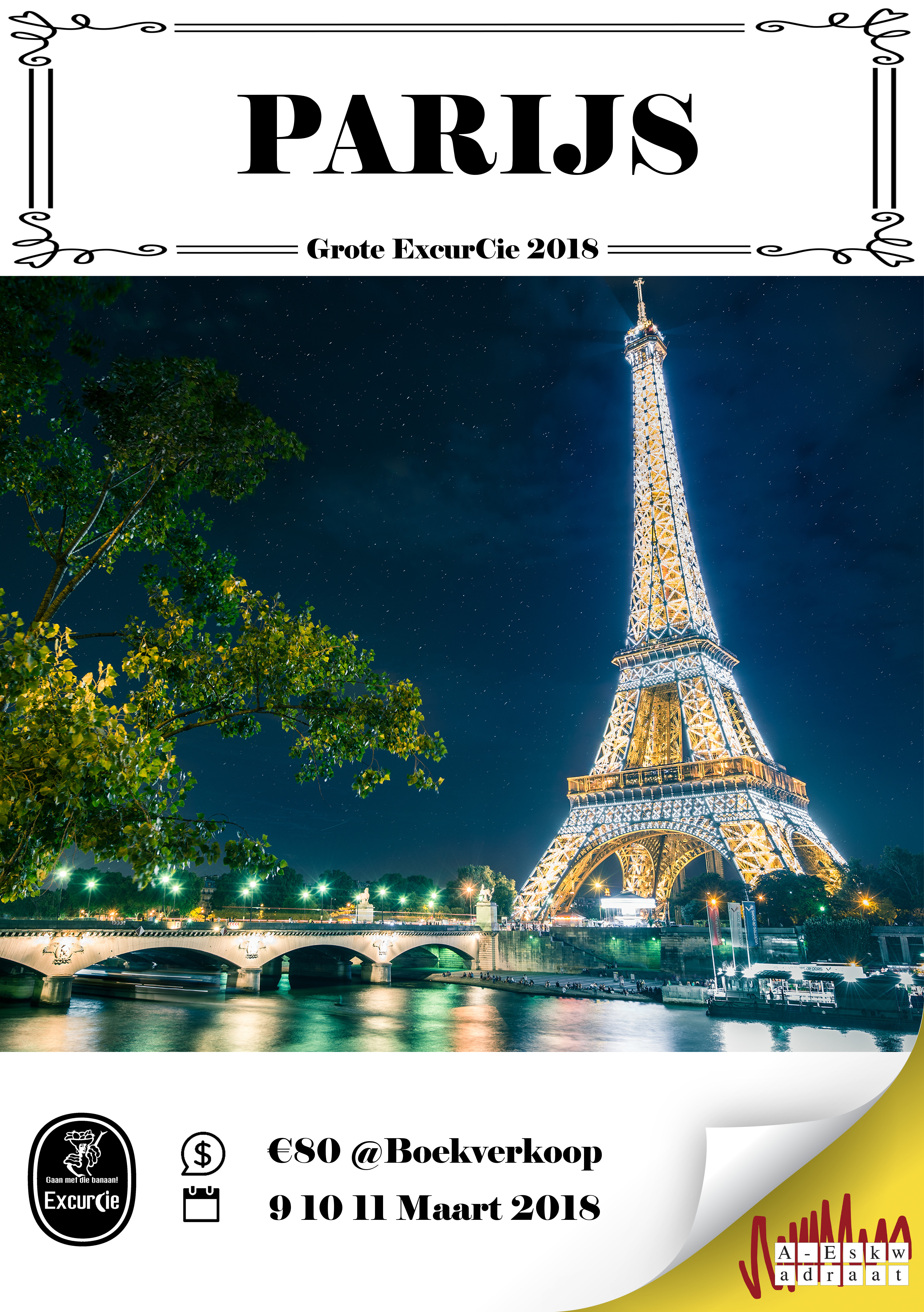Dit jaar gaan we met de Grote ExcurCie naar Parijs toe. Het zal zijn van 9 t/m 11 maart 2018. Vrijdagochtend vroeg zullen we met de bus vertrekken naar Parijs. Gedurende het weekend zullen we onder andere de universiteit bezoeken, een kroegentocht houden en nog veel meer. Een deel van de tijd zijn we als groep bezig, maar er is ook genoeg vrije tijd. Zondagmiddag zullen we weer teruggaan naar Utrecht.