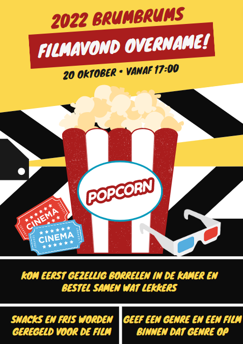 Heb jij zin in een gezellige avond in jouw favoriete gezelligheidskamer? Kom dan naar de filmavond overname! Vanaf vijf uur zal de kamer overgenomen worden en beginnen we eerst even gezellig met borrelen en bepalen welk genre het wordt en welke film we gaan kijken. Voor avond eten zullen we gezellig met z'n allen wat bestellen, discusieer onderling wat je wilt eten.