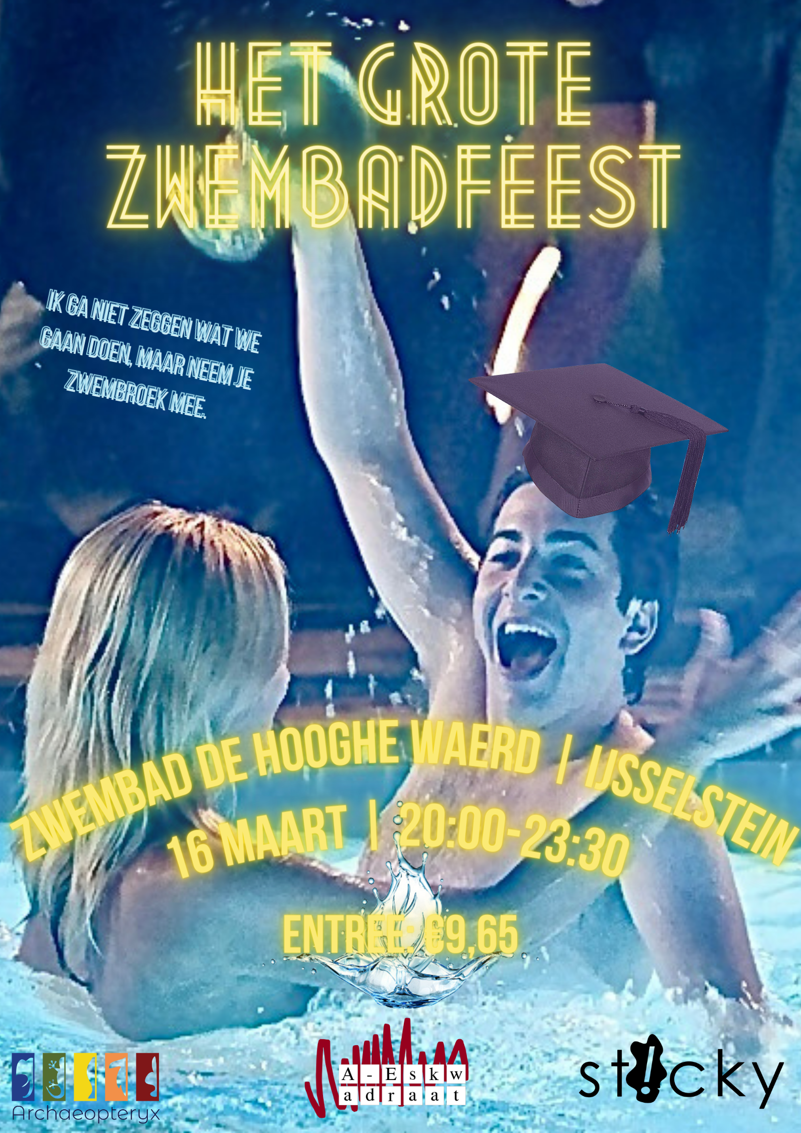 We're well into the new year, time for a splashy party! That's why the Feescie is organising, in cooperation with Sticky and Archaeopteryx: "The Big Pool Party". Are you excited to take off your clothes and get wet? Then you have come to the right place. The pool is located in IJsselstein, where you can travel easily by bus or tram. We start at 20.00, be there on time and bring your prettiest swimsuits. It is going to be an amazing night!