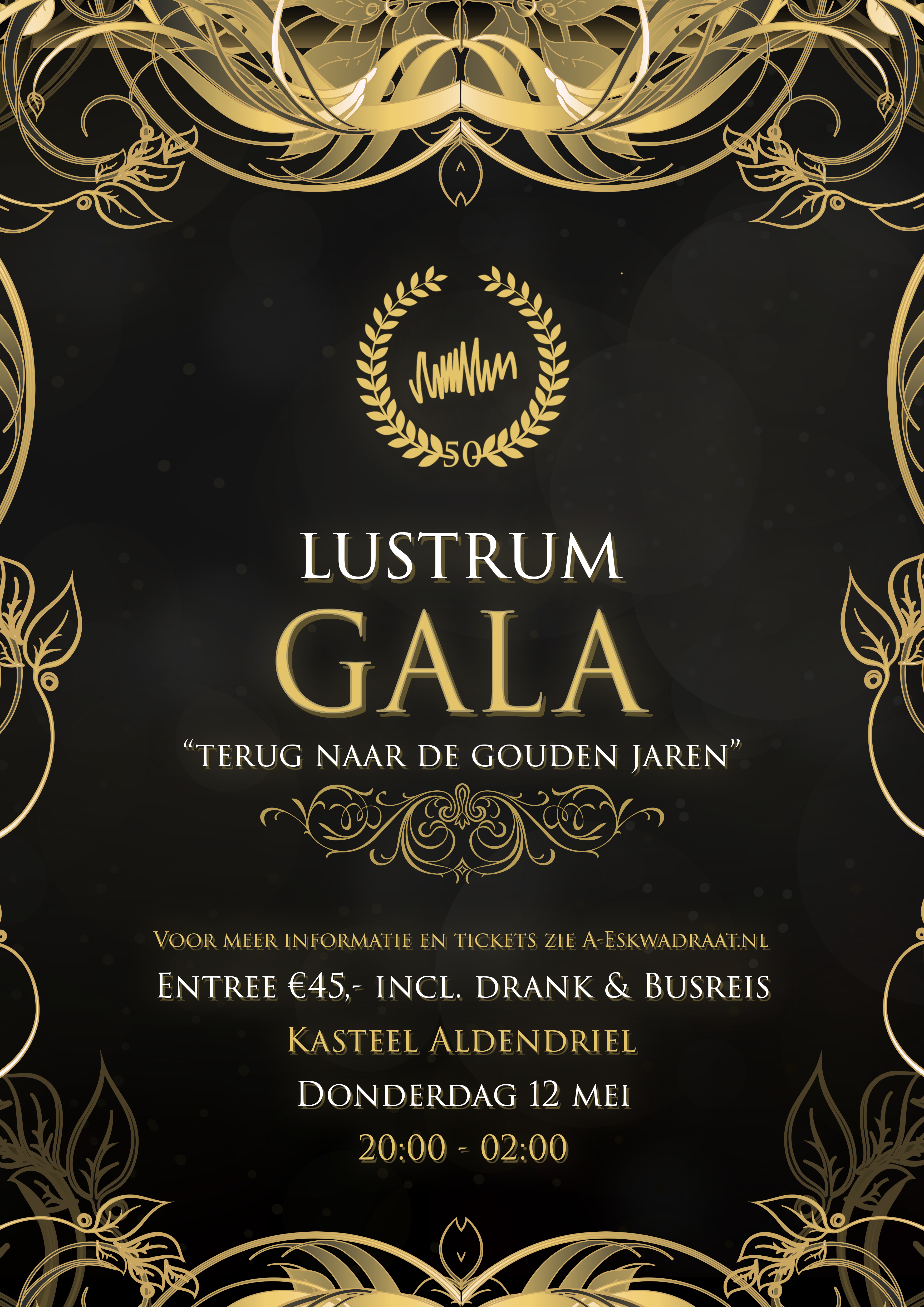 Op 12 mei is het eindelijk zo ver, het gouden Lustrumgala van A-Eskwadraat onder de zinspreuk "Terug naar de gouden jaren". Het gala zal plaatsvinden in Kasteel Aldendriel te Mill, waar je onder het genot van onbeperkte drankjes, een versnapering en de vetste muziek de tijden van corona achter je kunt laten.